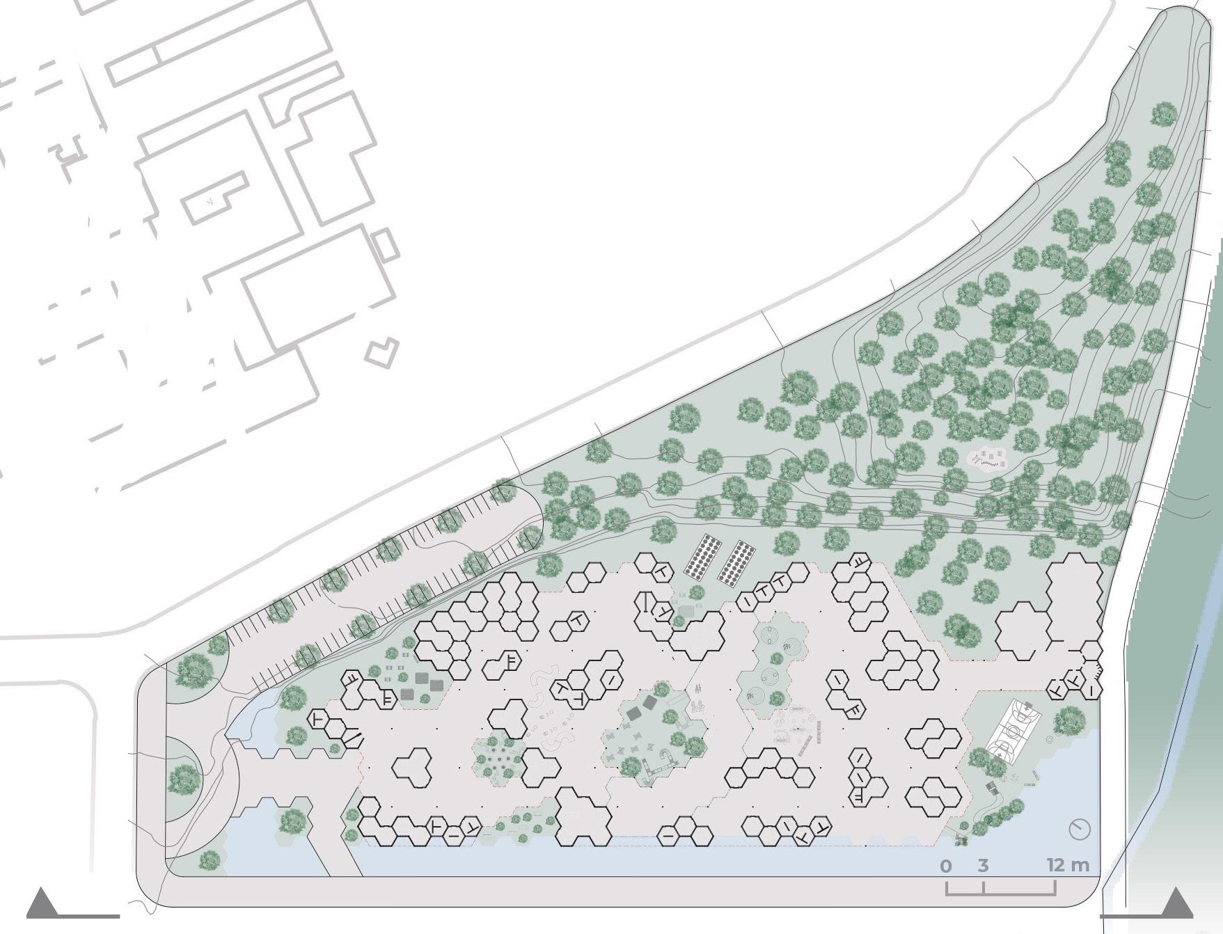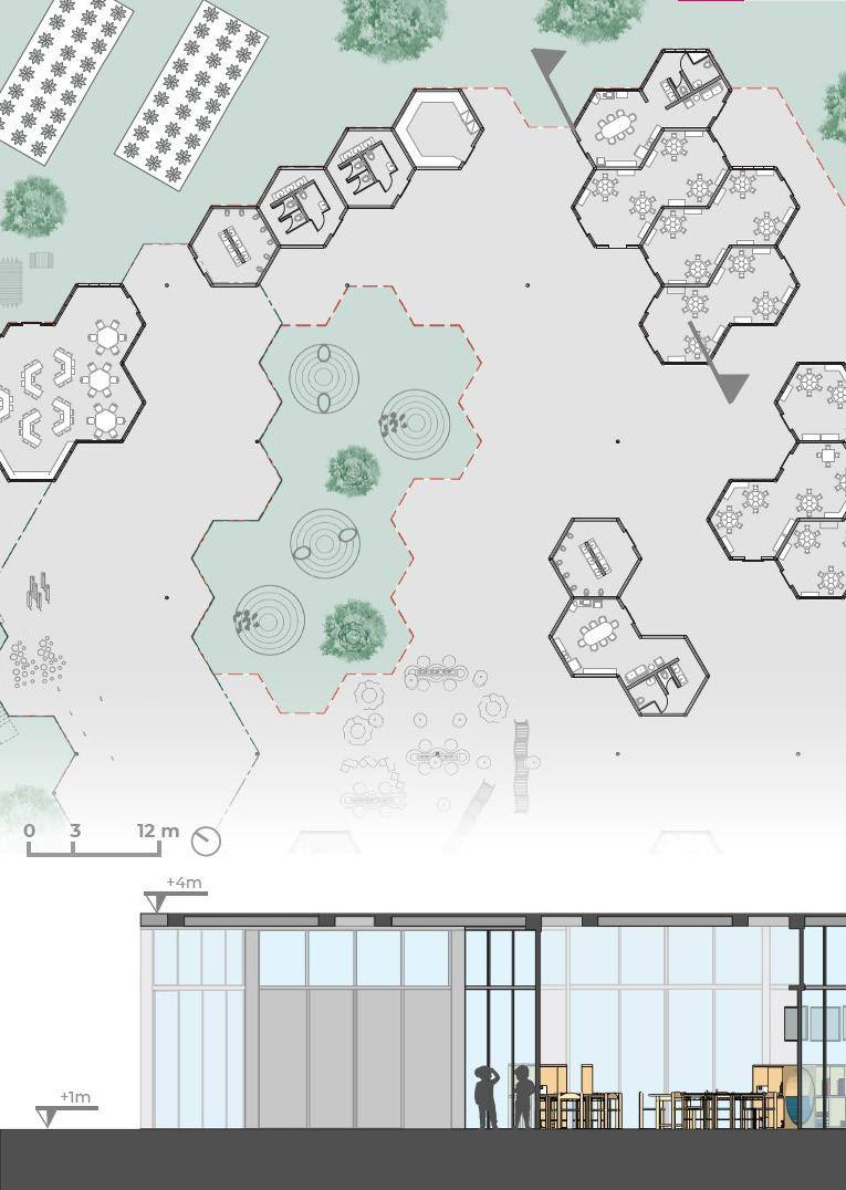 hexágonos colocados lado a lado de modo a nortear a distribuição horizontal do programa e otimizar a construção no externo terreno