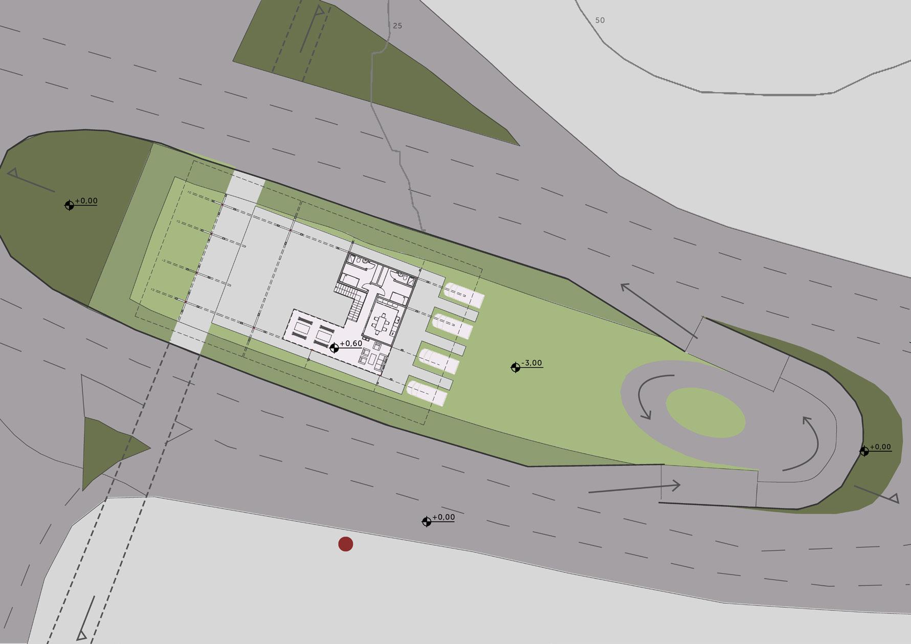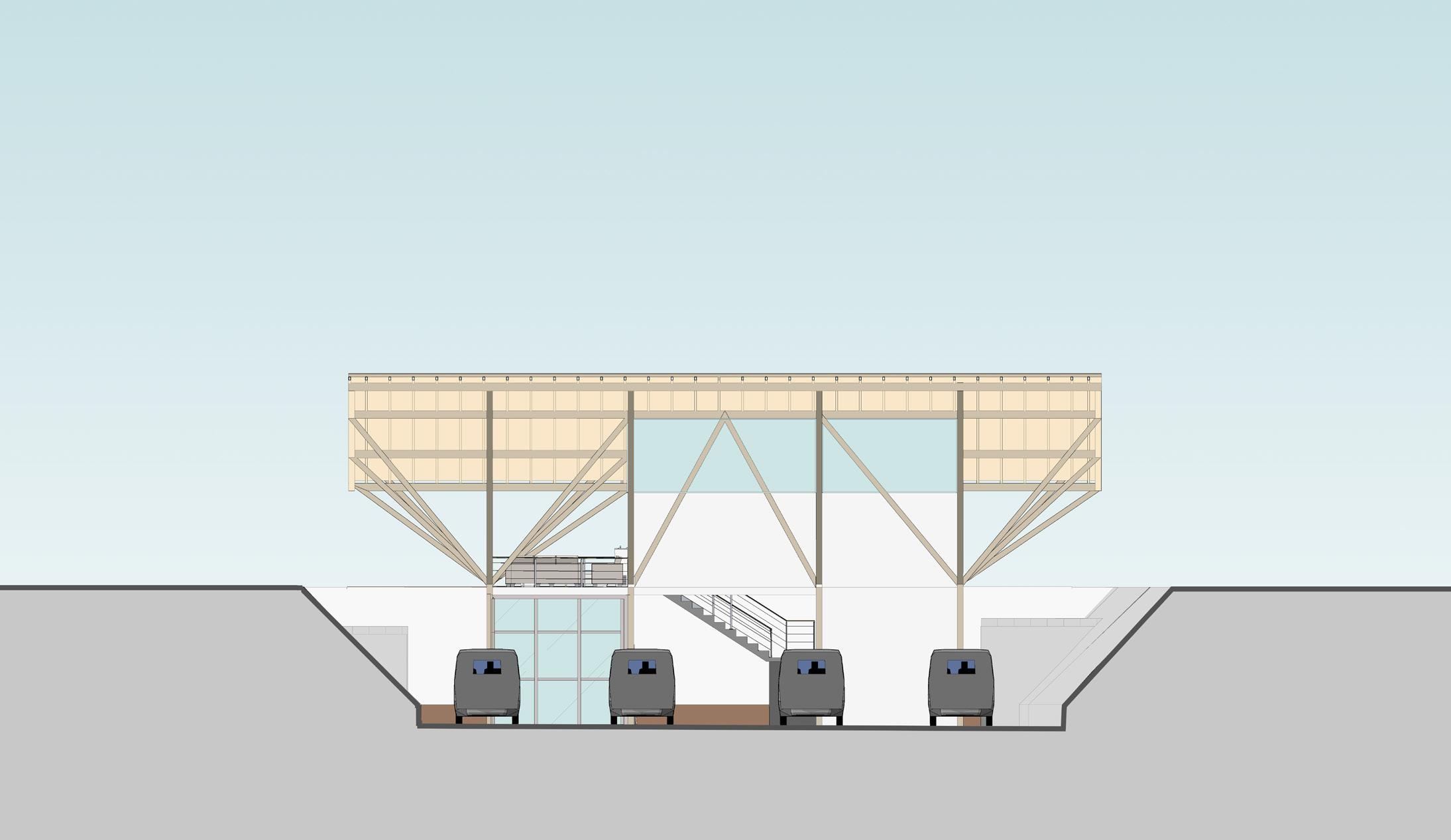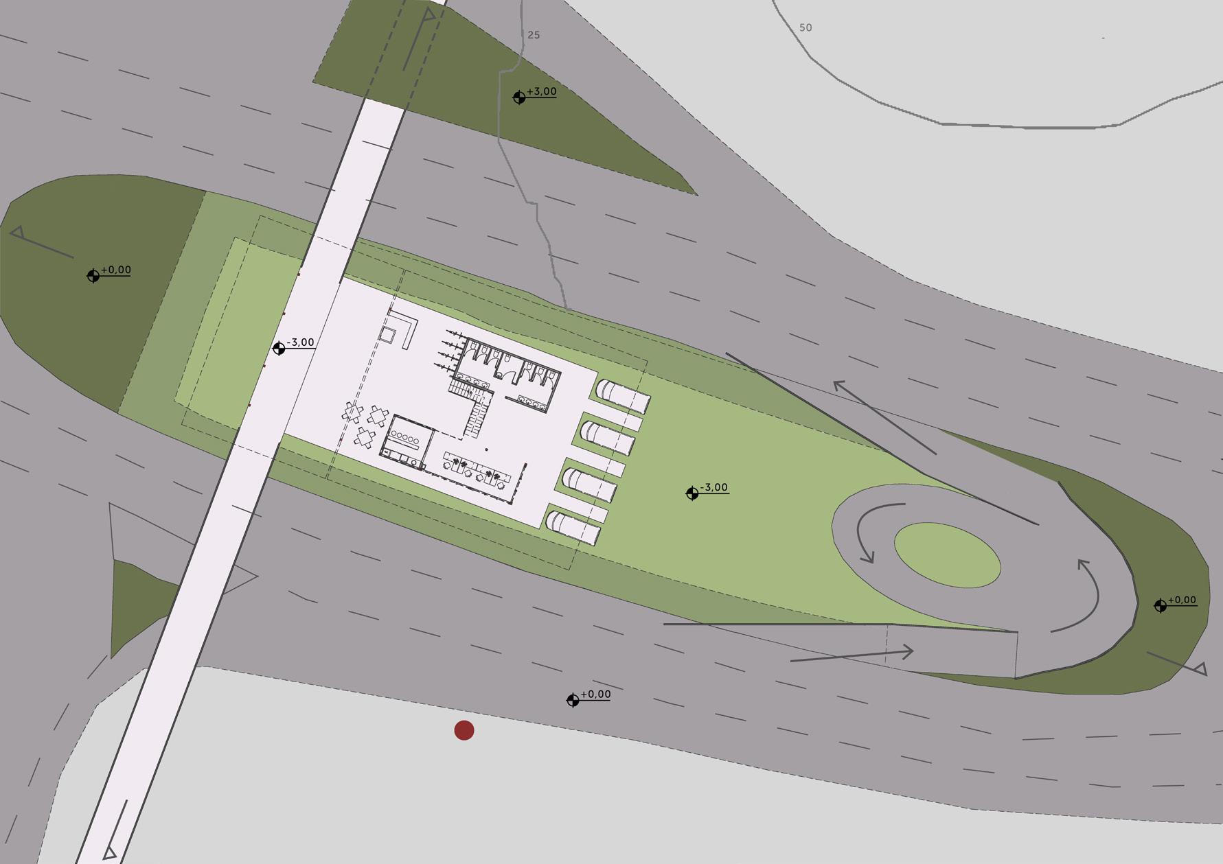 fluxos bem definidos : rebaixamento do projeto em relação à rodovia de modo a aproveitar faixas de aceleração e desaceleração pré-existentes e garantir a circulação e o embarque e desembarque