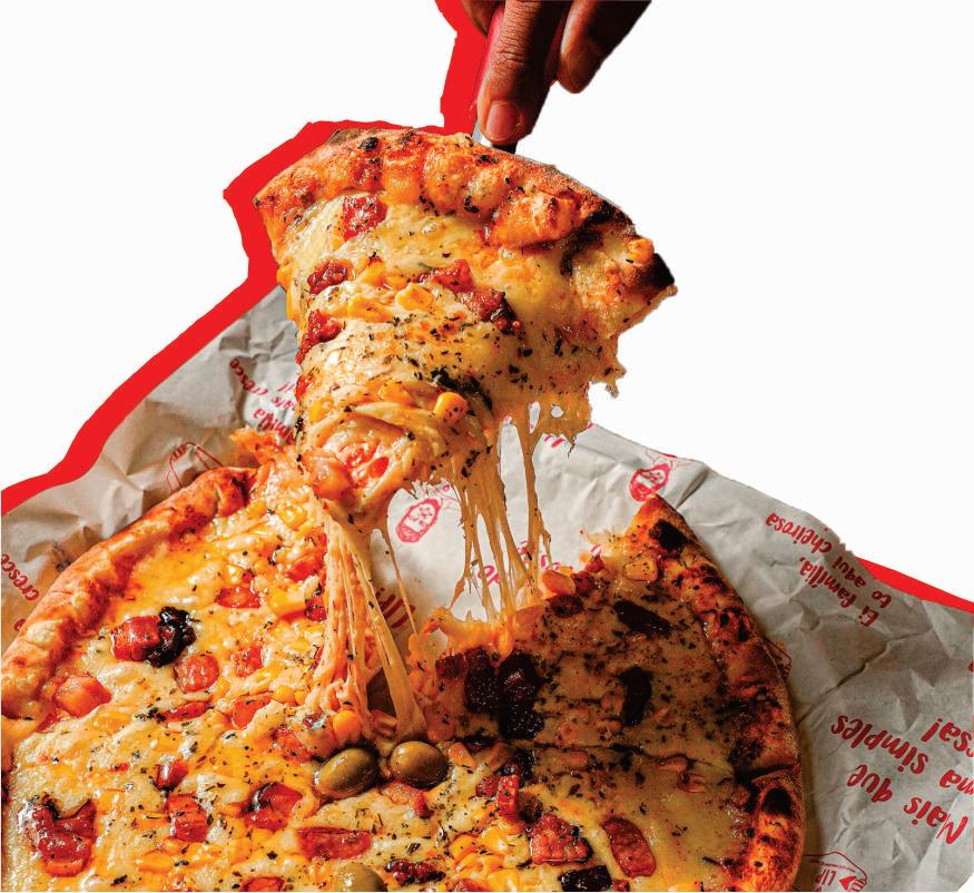 frango refogado, calabresa triturada sobre a mussarela derretida, milho e catupiry original
