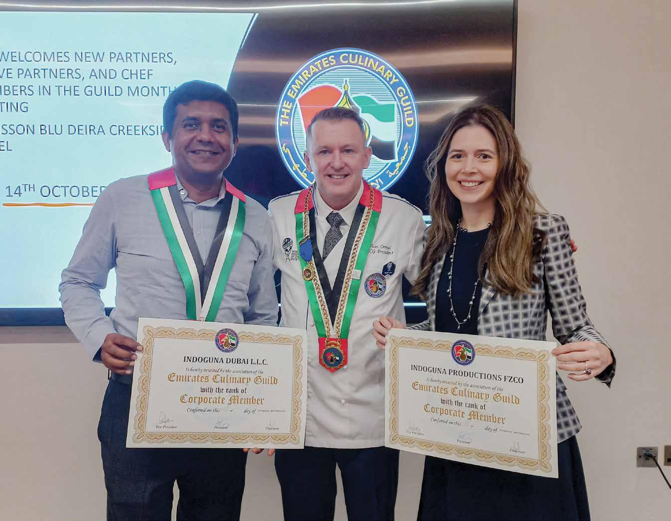 Ana Elena Saenz - Regional Business Development Manager, and Anoop Kumar – Director of Sales and Commercial – Indoguna Dubai LLC received the membership certificate from Chef Alan Orreal, President of the ECG.
