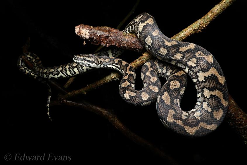 A relatively small python. The pigmentation of their ‘spots’ usually covers complete scales, giving the edges of their pattern a welldefined and ragged appearance. These pythons occupy wide variety of habitats ranging from rainforests to savannah, doing particularly well in rocky habitats. Insectivorous bats are a favourite food, and the python will often lie in ambush at cave entrances waiting to catch bats as they fly out from their roosting sites to forage.