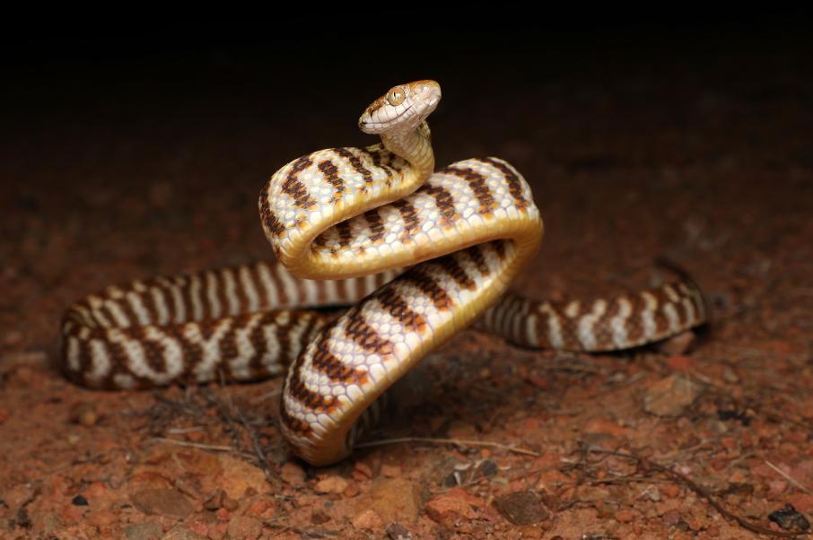 The largest venomous snake in Australia, with a widespread distribution across arid regions of the country. The colouring of this species varies across its range; in the Gulf Savannah region they are typically straw-yellow or gold and their two-toned scales often produce a net-like pattern across their bodies. They have a broad and flattened head, with large body scales. King Browns eat a wide variety of vertebrate prey, including other venomous snakes!