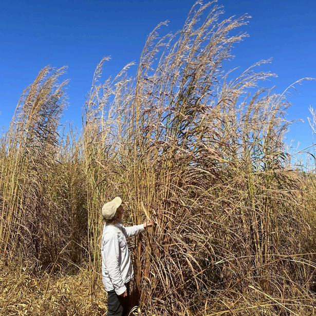Biodiversity Officer Ed inspecting some 4m-high gamba grass at a recent workshop