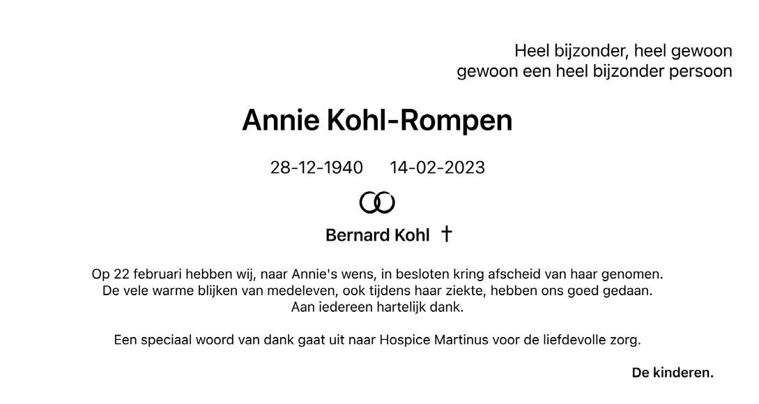 De familie wil iedereen bedanken voor de overweldigende belangstelling en het medeleven na het overlijden van mijn man, onze trotse vader en zorgzame opa