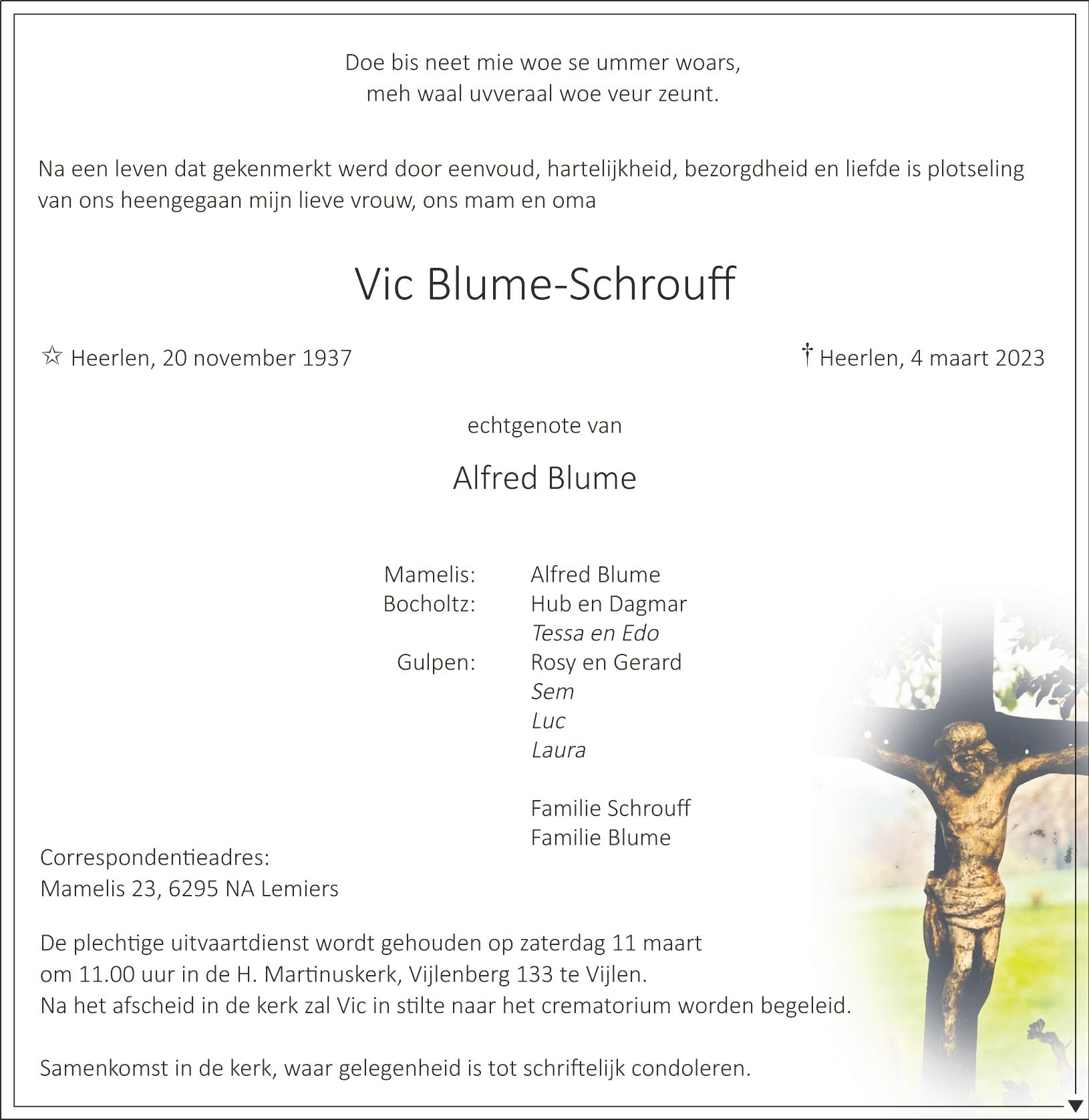 Zij overleed in Gulpen op 1 maart 2023 in de leeftijd van 80 jaar. De uitvaart heeft plaatsgevonden op dinsdag 7 maart 2023. De zeswekendienst zal plaatsvinden op zondag 16 april om 11.00 uur in de H. Petruskerk te Gulpen.