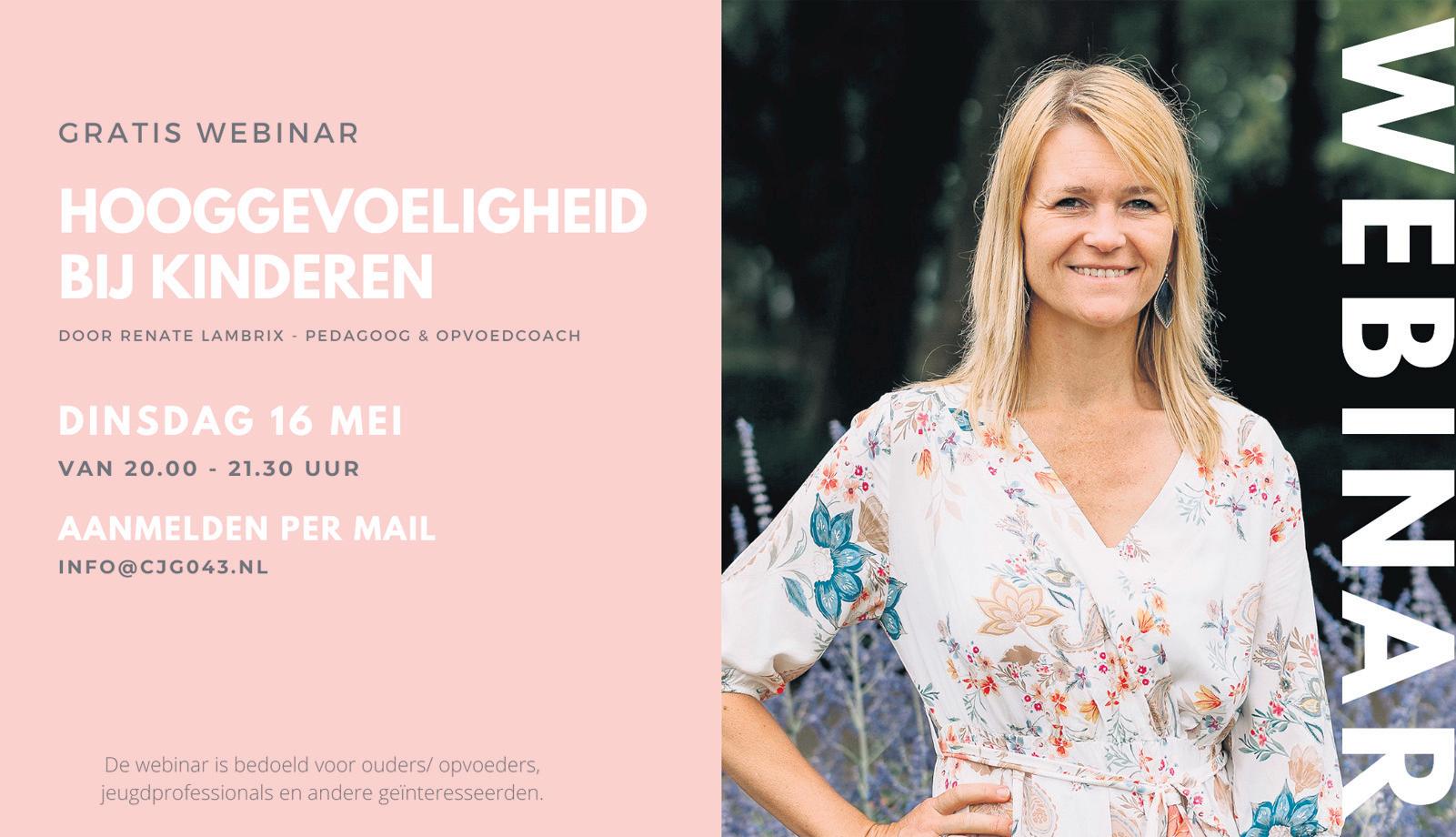 Op dinsdag 16 mei organiseert het CJG043 in samenwerking met Renate Lambrix (pedagoog, kinder- en gezinscoach) een gratis webinar over hooggevoeligheid bij kinderen. Ben jij ouder van een hooggevoelig kind en/ of wil je meer weten over dit onderwerp? Dan is deze webinar zeker interessant voor jou! De webinar start om 20.00 en duurt tot circa 21.30 uur. Op www.cjg043.nl vind je meer informatie. Meld je aan door een mail te sturen naar info@cjg043.nl.