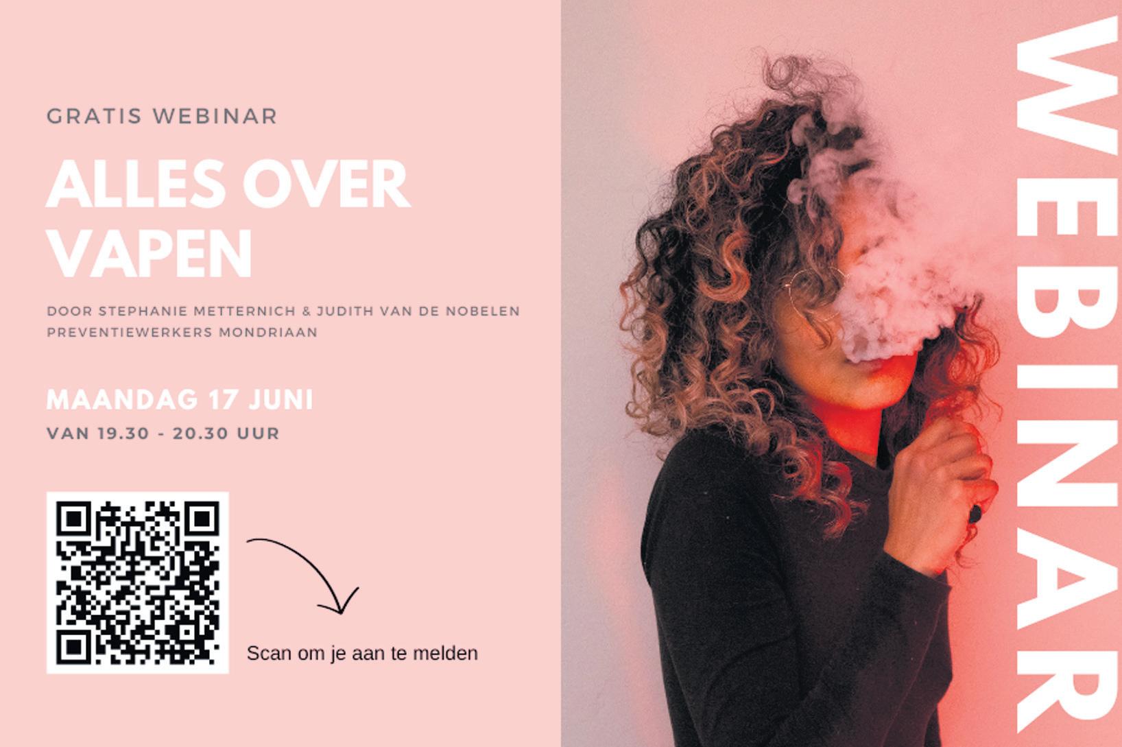 Wil jij meer weten over vapes en het gebruik ervan door jongeren? Ben je op zoek naar tips en advies voor hoe je er als ouder mee om kunt gaan als je kind vapet? Meld je dan aan voor het gratis webinar ‘Alles over Vapen’, verzorgd door twee experts van Mondriaan Preventie. Het webinar vindt plaats op maandag 17 juni en start om 19.30 uur. Meld je door een mail te sturen naar info@cjg043.nl of scan de QR code op de advertorial.