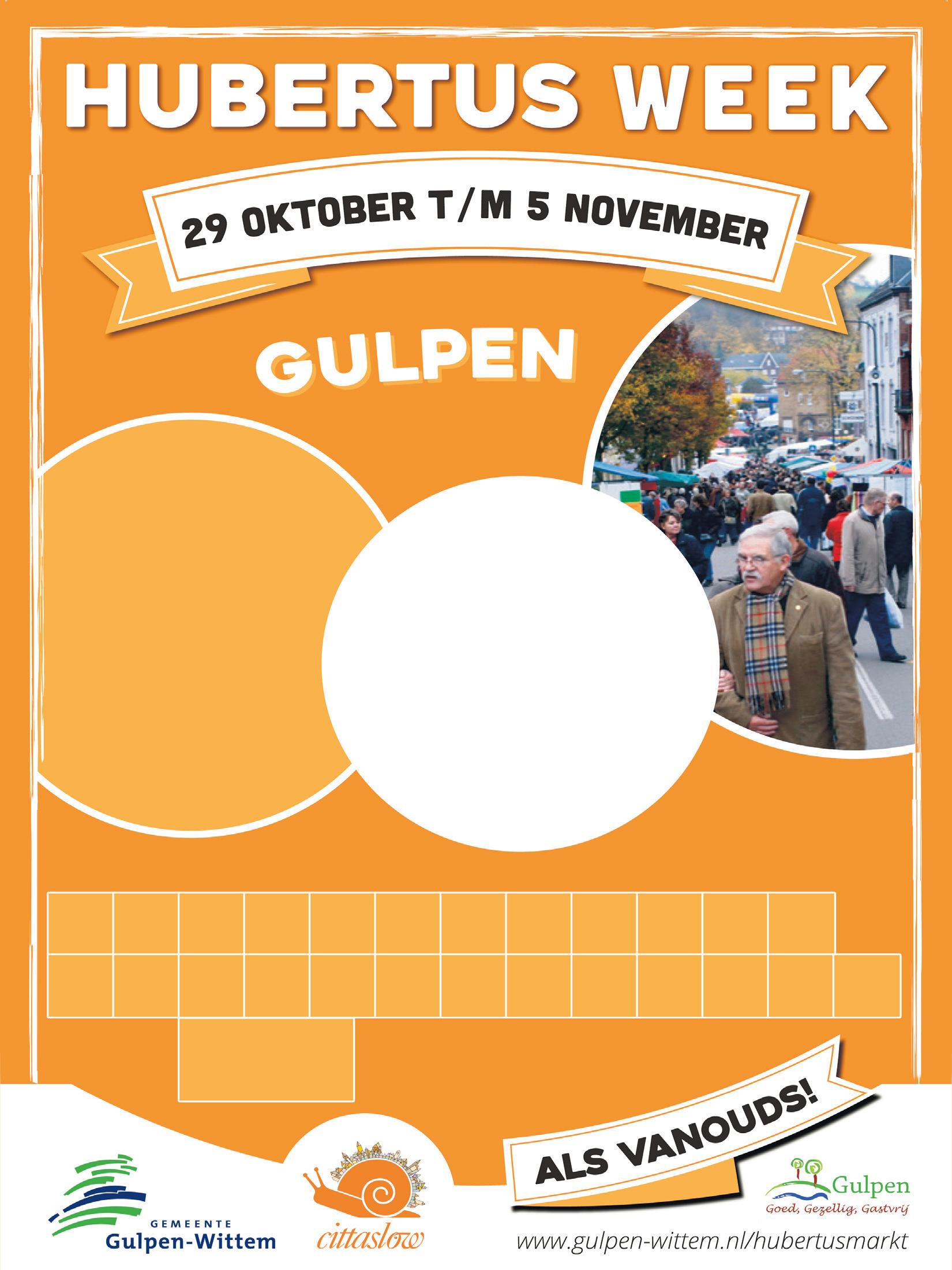 Gulpen - Wat een succes was, moet je vooral nog een keer doen. Daarom kunt u vanaf komende zaterdag voor het tweede opeenvolgende jaar in Gulpen, het winkelhart van het Heuvelland, terecht voor een Hubertuswéék met talrijke aanbiedingen en een nieuwe prijsvraag. Van 29 oktober tot en met 5 november, de dag waarop het hele centrum van Gulpen in het teken zal staan van de traditionele Hubertusmarkt (Vervolg op blz. 6)