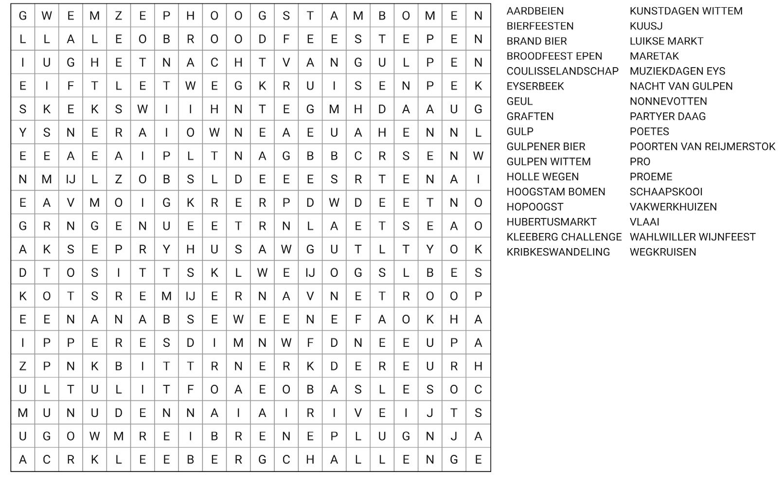 Wederom een PRO Gulpen-Wittem eindejaarspuzzel. Als u de goede oplossing instuurt voor 8 januari 2023 maakt u kans op een leuke prijs. Verder willen wij van de gelegenheid gebruik maken om u uit te nodigen voor de nieuwjaarsbijeenkomst van PRO Gulpen-Wittem. Deze vindt plaats op zaterdag 14 januari bij Lubosch Land in Ransdaal en bestaat uit twee onderdelen. Het eerste deel begint om 10.00u, heeft een informatief karakter en bestaat uit een rondleiding met presentatie en proeverijtjes. De kosten zijn e 7.50 per persoon. De nieuwjaarsreceptie begint rond 13.00 uur en deze is vrij toegankelijk. Voor meer informatie en aanmelden kunt u mailen naar Sacha Vos sachavos1975@gmail.com of 06-28716975. (Van te voren aanmelden is verplicht voor beide onderdelen).