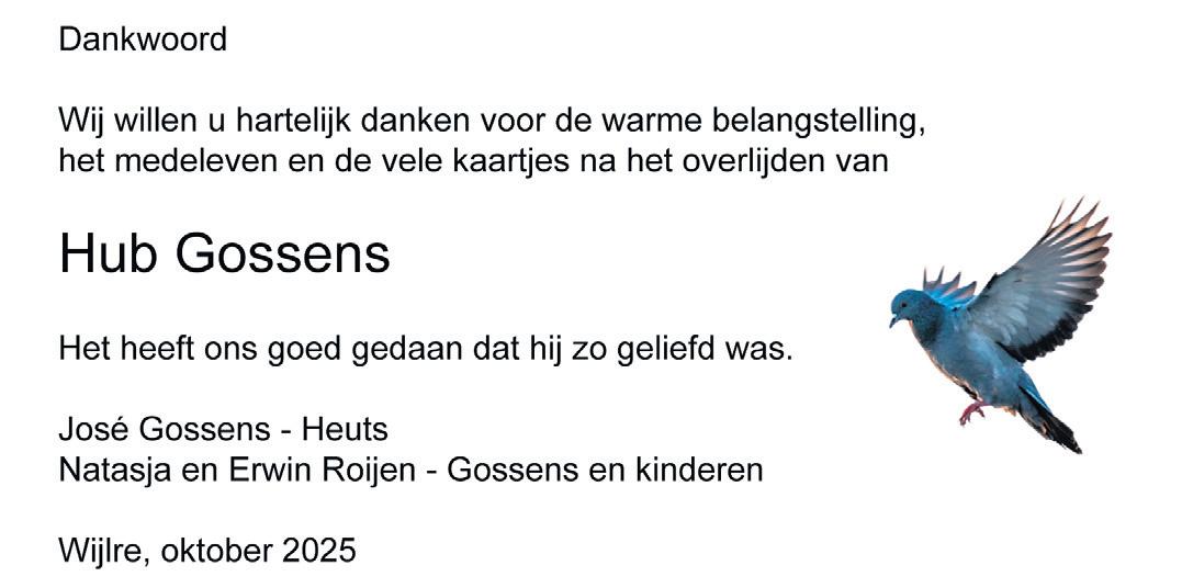 Zondag 12 oktober om 09.30 uur: H. Mis ter intentie van Ria Vaessen-Frissen (jrd.); Bertine Vleugels-Plum (coll.); Jan Wiertz en dochter Conny; Winand en Annie Knops-Crutsen; Albert en Mia Hofman-van Reij; Jo van den Boorn (collecte).