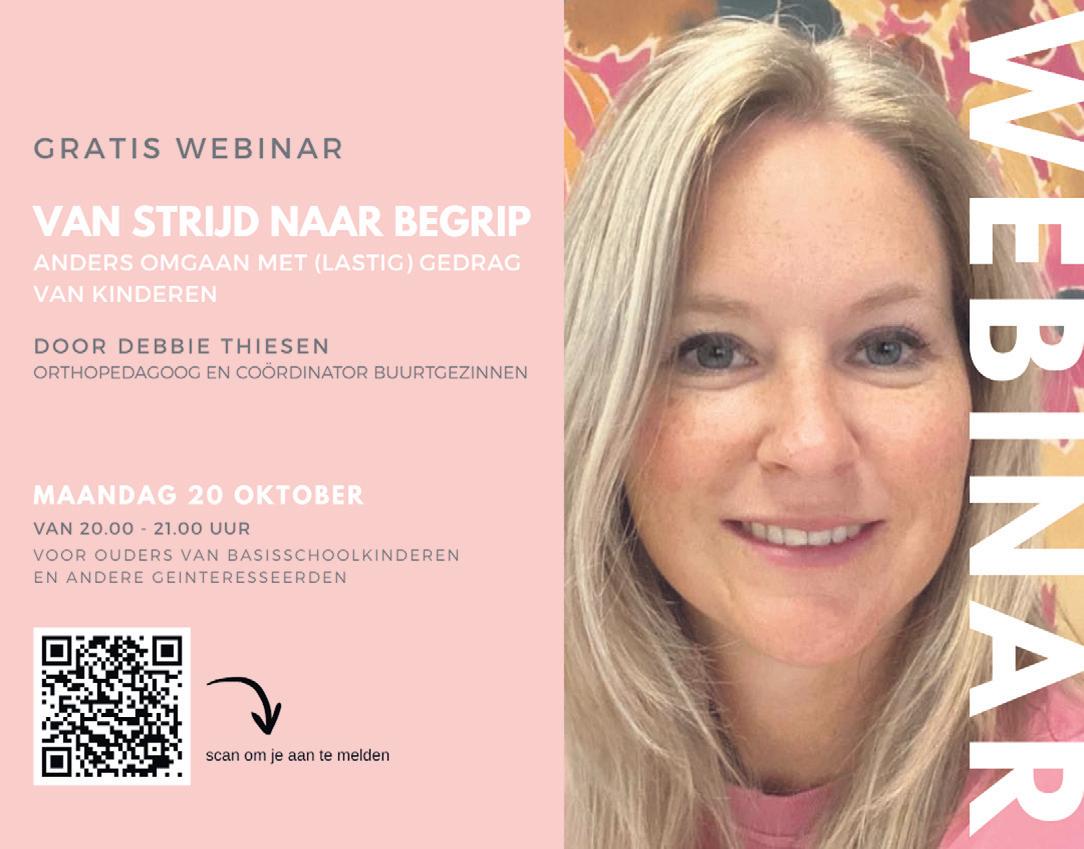 Algemeen - Op maandag 20 oktober organiseert CJG043 in samenwerking met Buurtgezinnen de gratis webinar ‘Van Strijd naar Begrip’, over het op een andere manier omgaan met (lastig) gedrag van kinderen. Dit webinar wordt verzorgd door Debbie Thiesen, orthopedagoog en coördinator Buurtgezinnen. Het is bedoeld voor ouders van kinderen in de basisschoolleeftijd en andere geïnteresseerden.