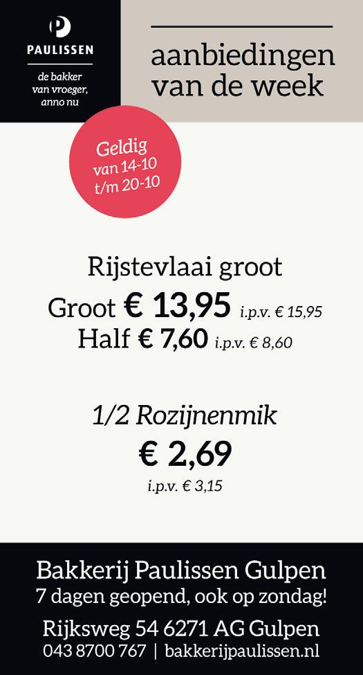 Zaterdag 11 oktober om 19.00 uur: H. Mis met Gregoriaanse opluistering ter intentie van ouders Cox-Duijsings en Netty Cox (jrd.); ouders RocksLemlijn (jrd.); Sjef en Maike Vincken-Jeanné (jrd); ouders Prumpeler-Gulpen en overleden familieleden (jrd); Jan Willems (jaardienst); Hans Kikken (offergang); Piet Lindelauf (offergang); Joep Hons (offergang); Piet Cratsborn (offergang). Collecte voor het onderhoud van de kerk.