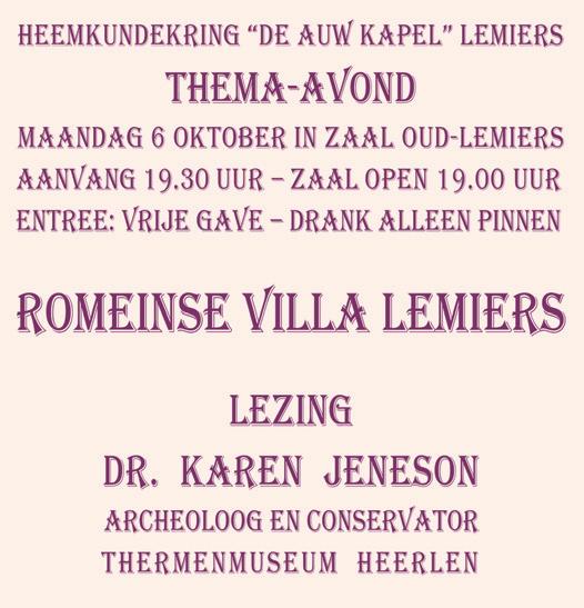 Op maandag 6 oktober a.s. zal niemand minder dan de conservator van het Thermenmuseum uit Heerlen, dr. Karen Jeneson, expert op het gebied van Romeinse villa’s, haar enorme kennis met ons delen. Zoek haar naam op internet op en sta versteld met welk fenomeen we hier van doen hebben. In zaal Oud Lemiers, Rijksweg 20 te Lemiers, gaan op die maandagavond 6 oktober om 19.00 uur de deuren open. Een vrije gave wordt op prijs gesteld! U bent van harte uitgenodigd.
