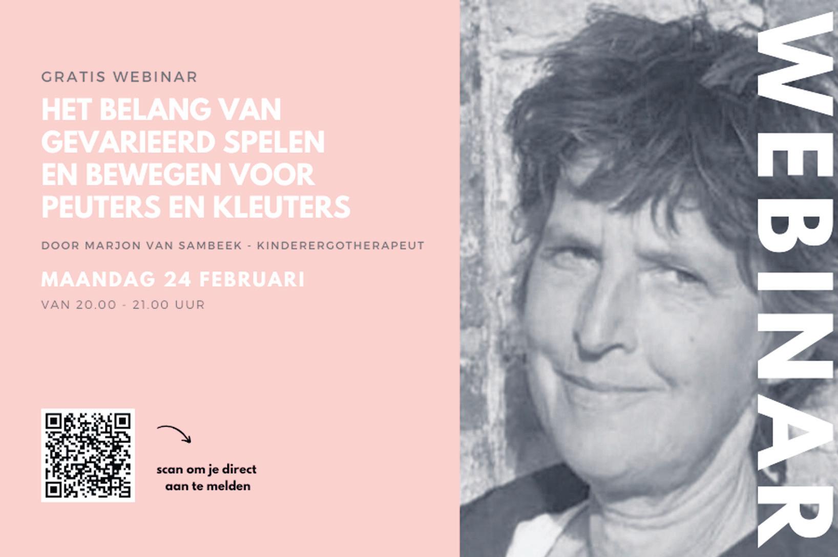 Op maandag 24 februari organiseert het CJG043 in samenwerking met Marjon van Sambeek (kinderergotherapeut) de webinar ‘Het belang van gevarieerd spelen en bewegen voor peuters en kleuters’. Dit webinar is bedoeld voor ouders met kinderen in de leeftijd van 2 tot 7 jaar en professionals die geïnteresseerd zijn in het onderwerp. De webinar start om 20:00 en duurt ongeveer 1 uur. Het belang van bewegen en spelen. De eerste 7 jaar is het van groot belang dat kinderen met hun hele lichaam bewegen en zoveel mogelijk álle zintuigen tijdens het spelen inschakelen. Als kinderen veel tijd krijgen om veel en gevarieerd te spelen en te bewegen, ontwikkelen ze hun grove en fijne motoriek, maar ook hun zintuigen beter. De samenwerking tussen beide ogen en beide handen wordt tevens gestimuleerd. Hierdoor worden de verbindingen in de hersenen beter aangelegd en wordt er een bredere basis gevormd om later te leren lezen, schrijven, spellen en rekenen. Ook lukt het daarna beter om bijvoorbeeld een jas dicht te knopen, veters te strikken of met mes en vork te eten. Vaardigheden die ontzettend belangrijk zijn wanneer je kind naar de basisschool gaat! De webinar ‘Het belang van gevarieerd spelen en bewegen voor peuters en kleuters’ Wil jij weten waarom gevarieerd spelen en bewegen zo belangrijk is? En welke invloed het heeft op de benodigde vaardigheden van de basisschool? Tijdens de webinar deelt Marjon van Sambeek haar kennis met je over het hoe en waarom! Ook geeft ze praktische tips hoe je als ouder of opvoeder gevarieerd spelen en bewegen kunt stimuleren; welke spelvormen, materialen en activiteiten zinvol zijn. Uiteraard is er ook ruimte om vragen te stellen. Interessant? Meld je aan via de QR code of stuur een mail naar info@cjg043.nl