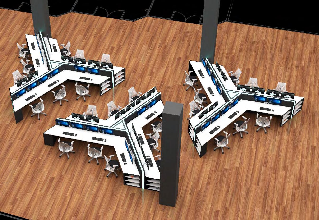 In this layout, each island of the workstation portrays a connection between the user and the block at the center; creating an intellectual bond between the employees and their work.