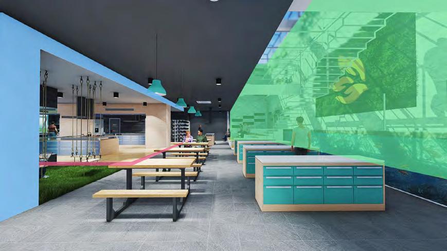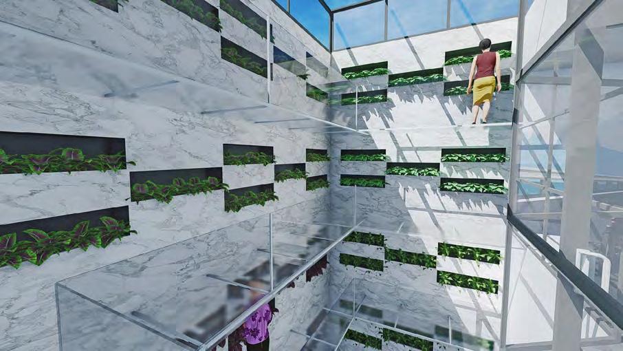 Elevated seating space for orientation discussion, cooking lessons, and gardening instructions and connected with cooking space and gardening space. Groups will be made based on their biometric data and will be trained together throughout the course.