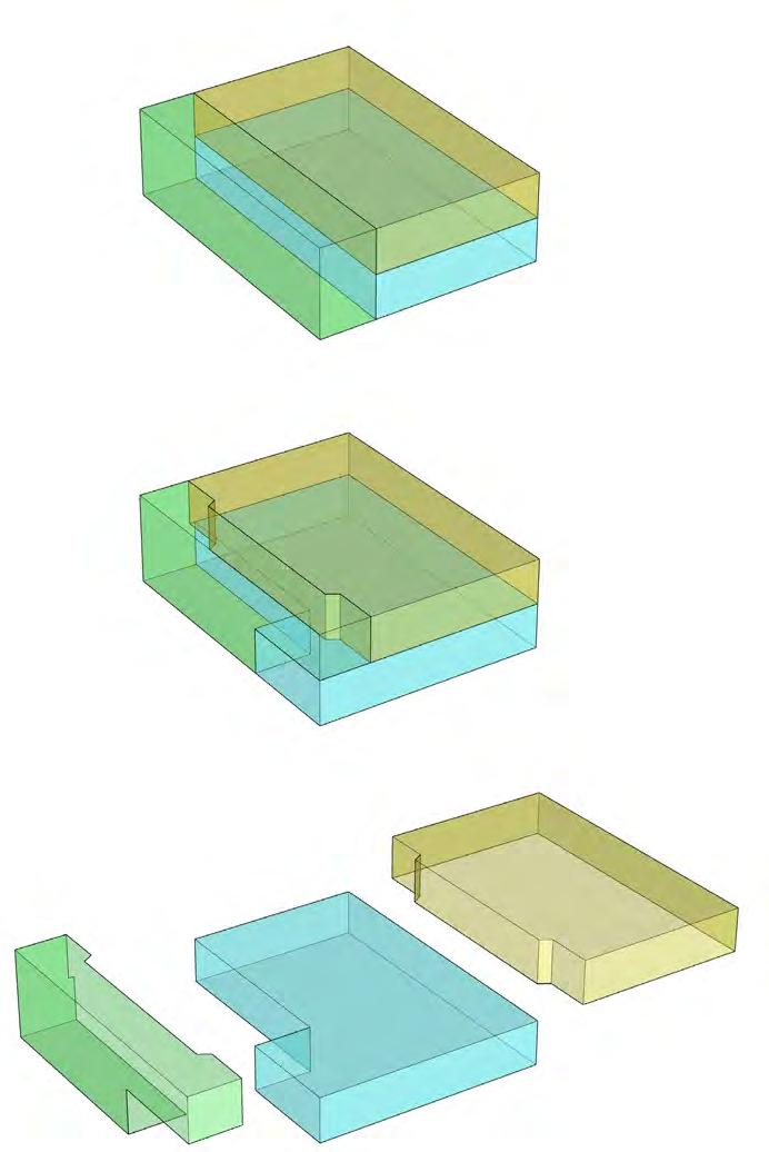 The image on the right demonstrates the changes in massing. Spaces have been altered and merged into one another to improve connectivity and functionality to prevent users from feeling separated by the space and allowing them to experience one space while being in another.