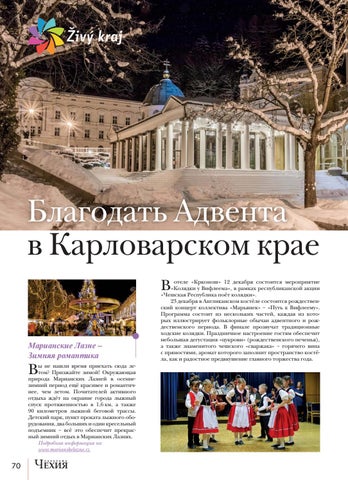 отеле «Крконош» 12 декабря состоится мероприятие «Колядки у Вифлеема», в рамках республиканской акции «Чешская Республика поёт колядки». 23 декабря в Англиканском костёле состоится рождественский концерт коллектива «Марьянек» – «Путь к Вифлеему». Программа состоит из нескольких частей, каждая из которых иллюстрирует фольклорные обычаи адвентного и рождественского периода. В финале прозвучат традиционные ходские колядки. Праздничное настроение гостям обеспечит небольшая дегустация «цукрови» (рождественского печенья), а также знаменитого чешского «сваржака» – горячего вина с пряностями, аромат которого заполнит пространство костёла, как и радостное предвкушение главного торжества года.