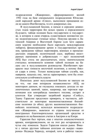 подразделения «Жаворонки», сформированного весной 1992 года на базе специального подразделения Югослав ской народной армии «Сокол», выполняли приказания ес ли не самого Изетбеговича, то его доверенных лиц. В мусульманской Боснии, в начале и середине девяно стых годов территории без ясных границ и определенного будущего, тайная полиция была государством в государст ве, в котором в свою очередь существовали неизвестно ко му подконтрольные «темные зоны». Покупка оружия в Ла тинской Америке и Восточной Европе (для чего сараев ским властям необходимо было нарушать международное эмбарго), финансирование армии и государственных орга нов, проведение тайных переговоров, военных и пропаган дистских операций, политический сыск, вербовка иност ранных наемников и добровольцев — круг полномочий АРД был столь же расплывчатым, сколь значительными считались возможности влияния тайной полиции на ба ланс сил в мусульманском руководстве. Изетбегович пре красно знал тонкости восточной политики, а потому боял ся удара в спину. Только всеведущая тайная служба, как, наверное, казалось ему, могла гарантировать хотя бы отно сительную устойчивость власти. Поскольку денег мусульманской Боснии не хватало ни на что, «во имя интересов независимости» АРД, по некоторым данным, не гнушалось извлекать доходы из ма лопочтенных занятий, таких, например, как торговля нар котиками или контрабанда танкового топлива, сигарет и алкоголя. Как утверждает загребский журнал «Глобус», Эдину Гараплии предстояло проверить, в частности, дей ствительно ли некоторые высокопоставленные босний ские политики (в обход других высокопоставленных бос нийских политиков), используя возможности подразделе ния «Жаворонки», вывозили из страны полученные от иностранных благотворительных организаций средства и скрывали их на банковских счетах в Австрии и на Кипре. Гараплия был тертым, еще с опытом социалистических времен, контрразведчиком, но на этот раз осторожность и чутье ему изменили. Задело Гараплия взялся рьяно. Вмес те с пятью другими тайными агентами он выкрал «жаво ронка» Неджада Херенду, который, хотя и работал таксис