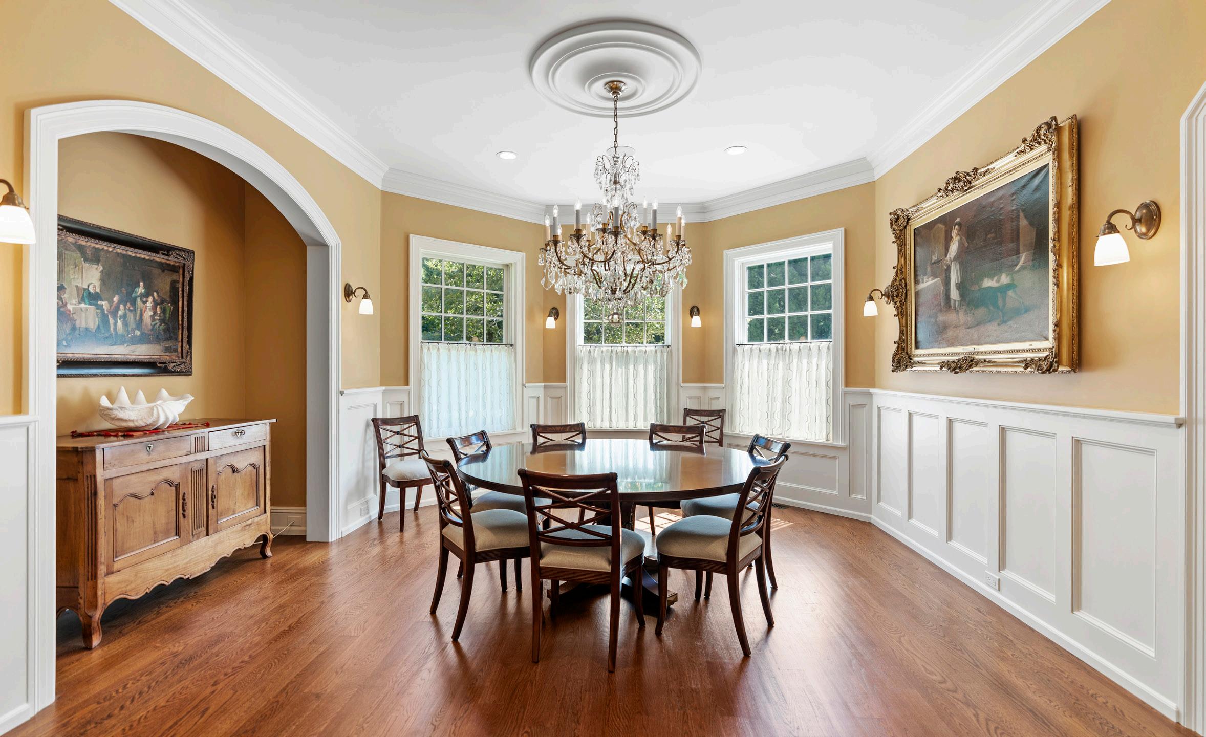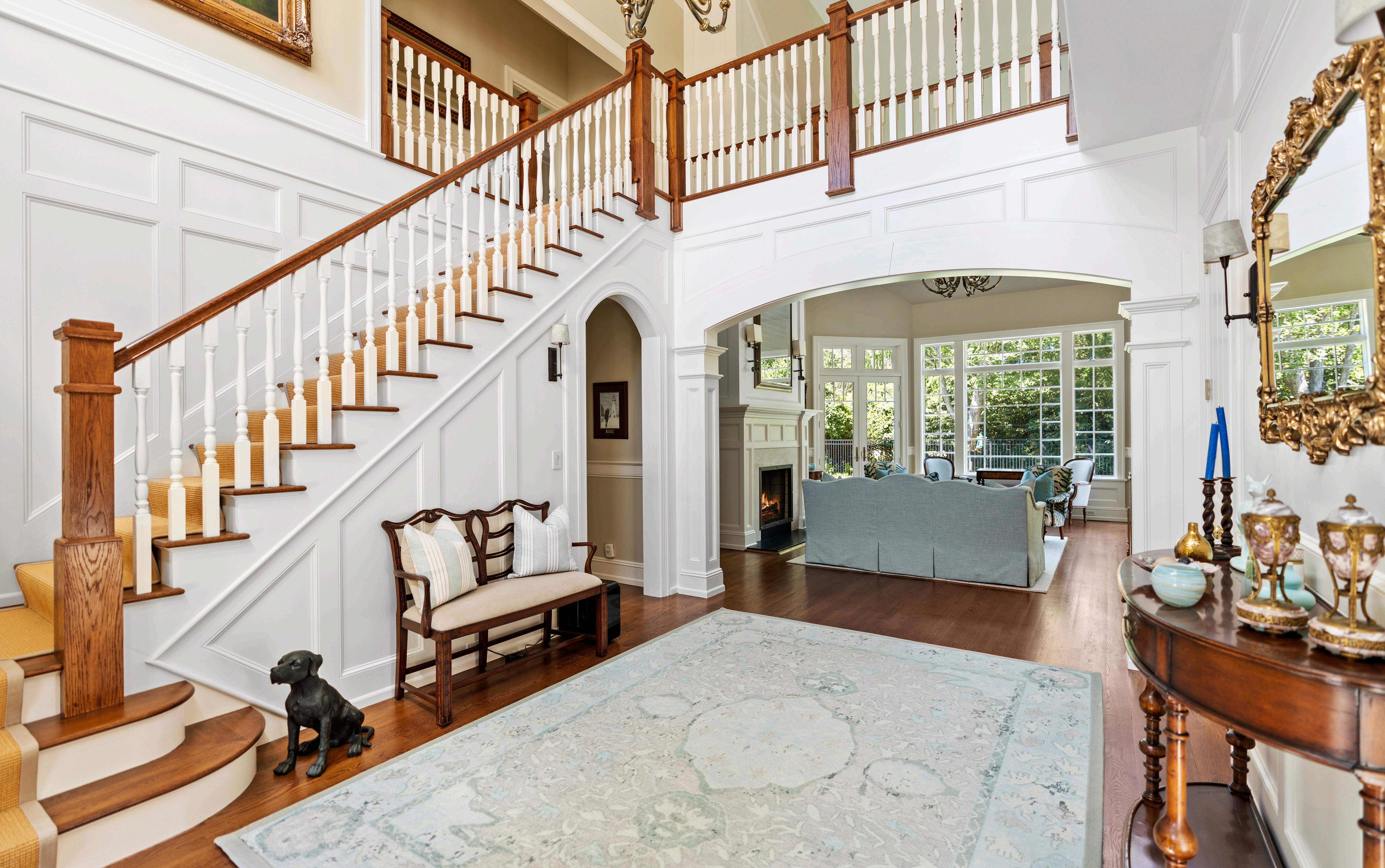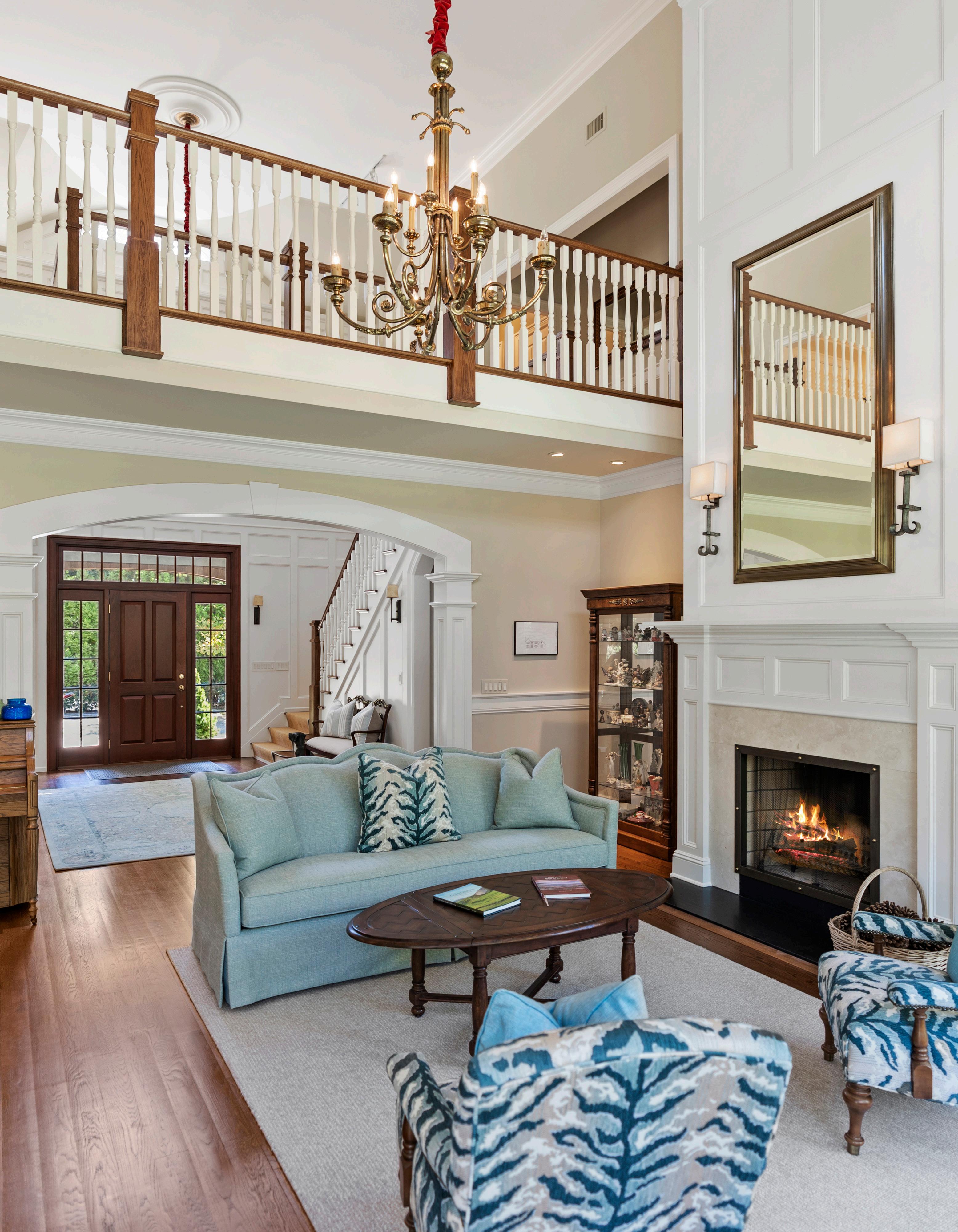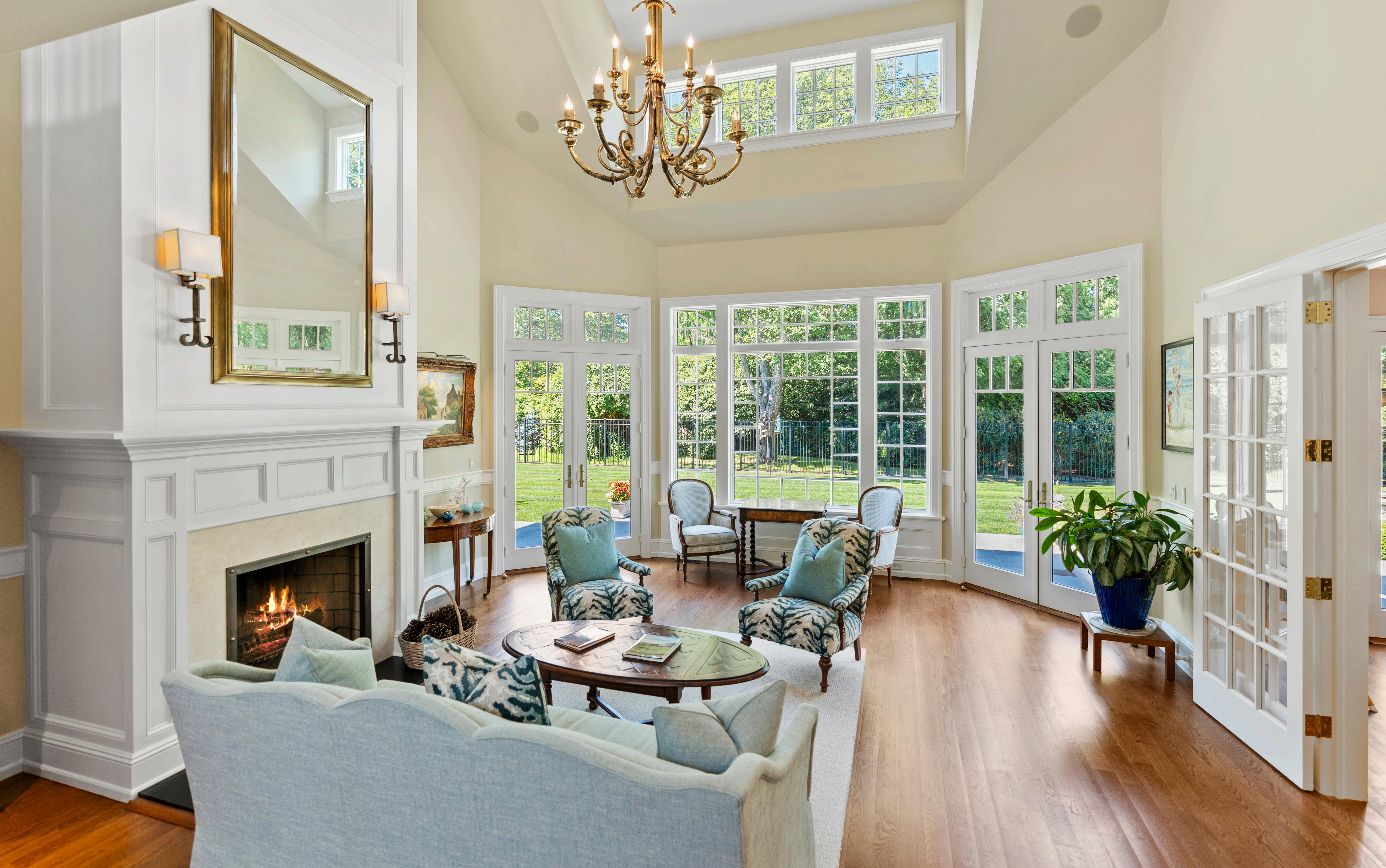 • Great Room with Wood Burning Fireplace, Double-height Ceilings and French Doors to the Backyard