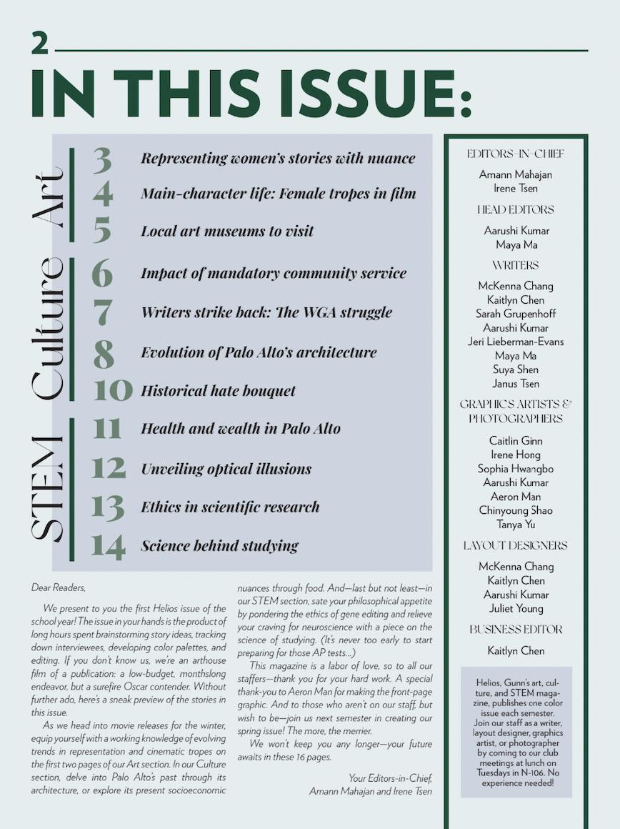 Helios, Gunn’s art, culture and STEM magazine. publishes one color issue each semester. Join our staff as a writer, layout designer, graphics artist, or photographer by coming to our club meetings at lunch on Tuesdays in N-106. No prior experience needed!