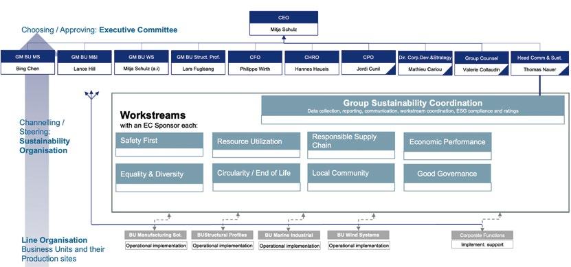 The Board of Directors is responsible for reviewing the sustainability strategy and performance on an annual basis. The Board also approves the annual Sustainability Report. The Executive Committee (EC) executes our sustainability strategy primarily through the line organisation with the support of a sustainability coordination team. Dedicated workstreams implement actions and recommend targets within their respective priority focus areas that were found material. The EC-Sponsor of a workstream coaches the respective workstream lead and is ultimately responsible for the workstream performance against the mission and KPIs, the workstream actions, and for ensuring alignment with our strategy and standards.