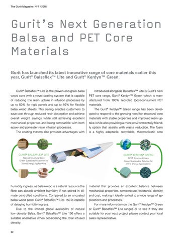 Gurit’s Next Generation Balsa and PET Core Materials Gurit has launched its latest innovative range of core materials earlier this year, Gurit® Balsaflex™ Lite and Gurit® Kerdyn™ Green. Gurit® Balsaflex™ Lite is the proven end-grain balsa wood core with a novel coating system that is capable of reducing the resin uptake in infusion processes by up to 50% for rigid panels and up to 40% for flexible balsa wood sheets. This saving enables customers to save cost through reduced resin absorption and achieve overall weight savings while still achieving excellent mechanical properties and being compatible with both ® epoxy and polyester resin infusion processes.
