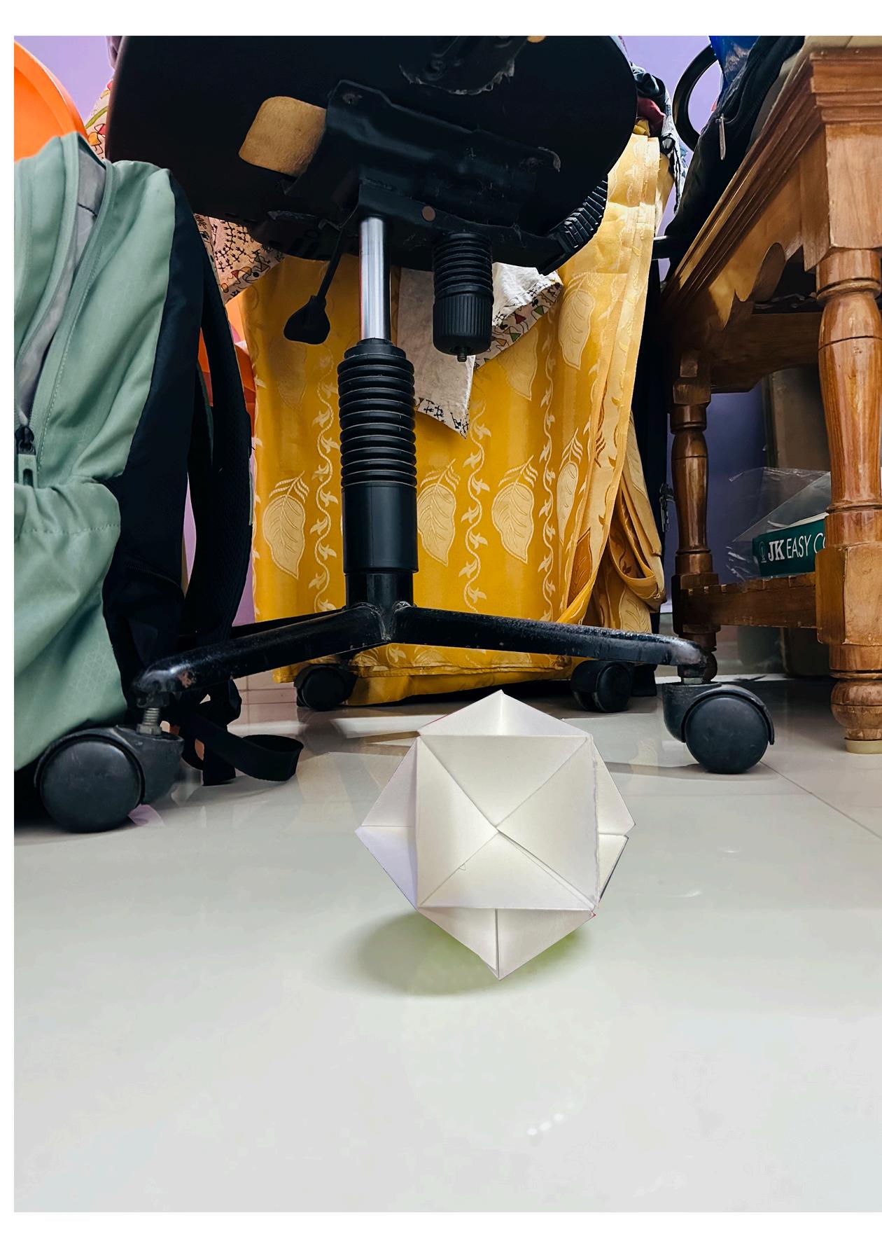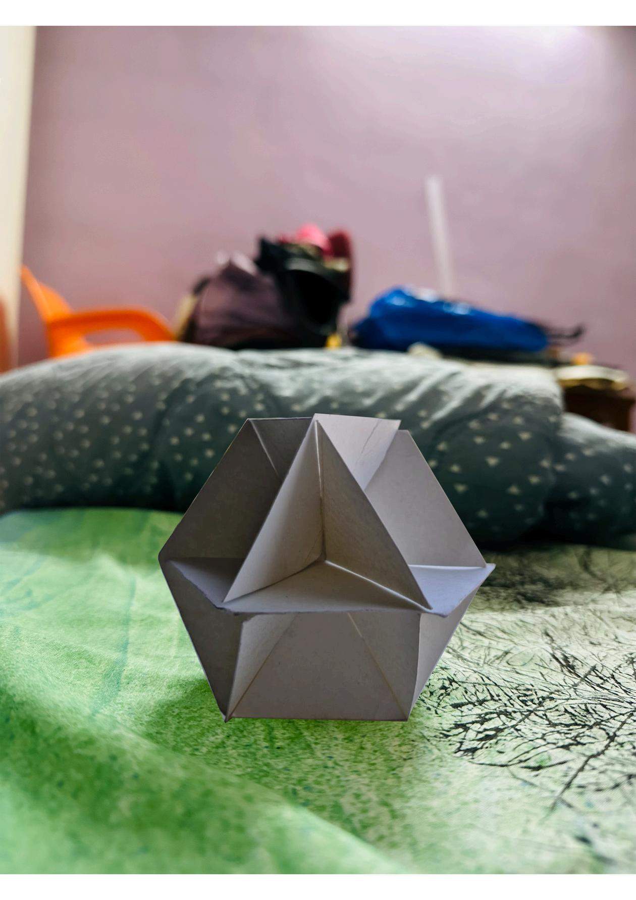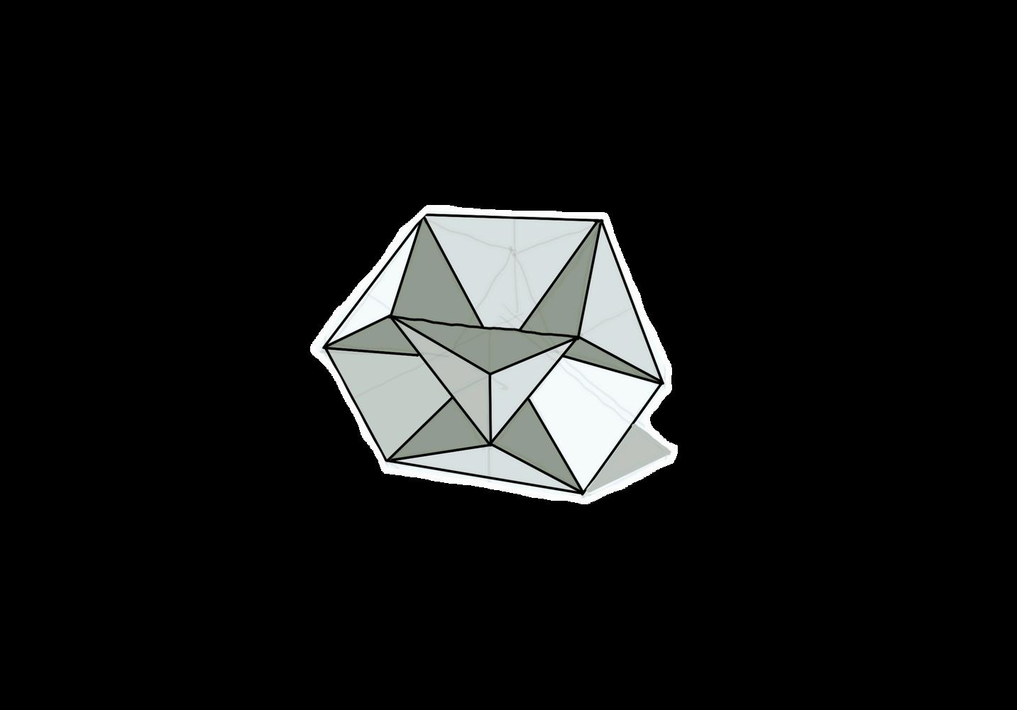 The model is made from hexagons but appears as a square from all six elevations. It consists of four outer edges, with two perpendicular lines and two diagonal lines intersecting at the center. The intersection creates a recessed depression on each face, adding depth and symmetry. This geometric design maintains a uniform, balanced appearance across all views, combining intricate structure with a clean, square-like visual effect.
