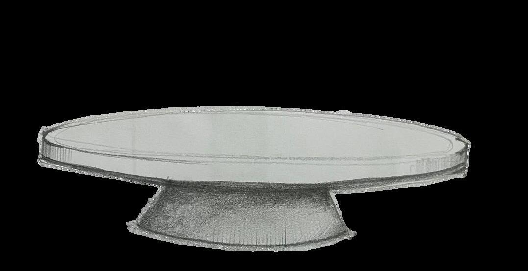 The sketch represents a rotating turntable or pedestal, likely used for pottery, cake decoration, or display purposes. The structure consists of a flat circular top platform and a wider conical base for stability. It is likely made from metal, wood, or ceramic, depending on its intended use. The top disc may be welded, screwed, or riveted to the base, ensuring a secure attachment. If designed to rotate, it could incorporate a ball-bearing mechanism or central pivot for smooth movement. The edges of the top appear reinforced, possibly with metal rims or extra layering for added durability. The base may have a textured or ribbed surface to improve grip and stability.