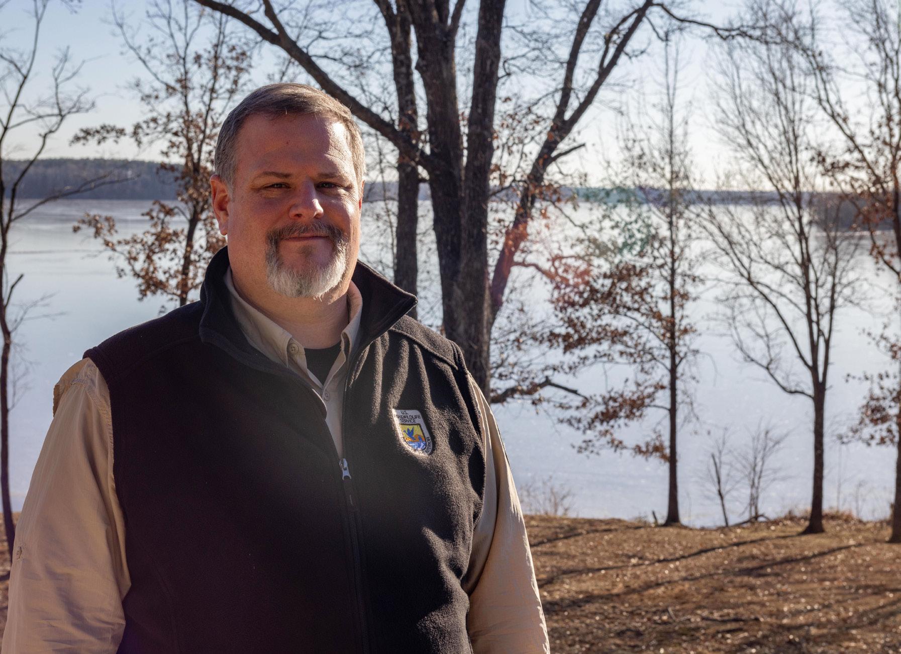 Justin Sexton, Refuge Manager of Crab Orchard National Wildlife Refuge and Cyprus Creek National Refuge, poses for a portrait in front of Crab Orchard Lake Jan. 24, 2025 at the Crab Orchard National Wildlife Refuge headquarters in Marion, Illinois. Enan Chediak | @enanchediak