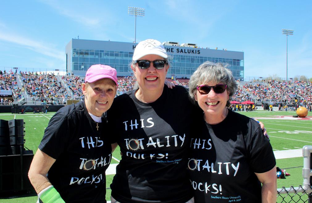 Among the visitors were Sara Martens of Omaha, Nebraska, and Carolee Cronin of Woodbine, Iowa. The women met when they were in the eighth grade and, now in their 60s, decided to visit Carbondale for the eclipse. Joined by Kathy Wischow of Omaha, Nebraska, whom they met through mutual friends, they embarked on a “girls trip” to southern Illinois, donning matching t-shirts for the event. The shirts said “This totality rocks!”
