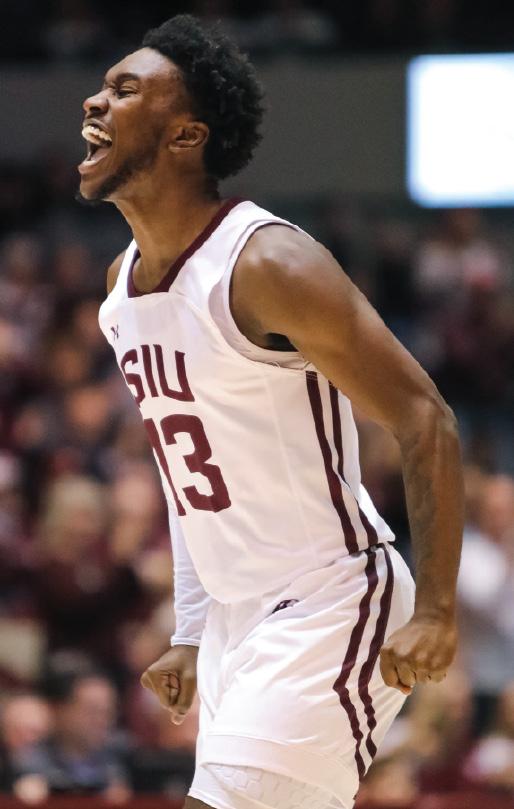 Jawaun Newton (13) yells in celebration after the Salukis pull ahead of Missouri State early in the game Feb. 5, 2022 at Banterra Center in Carbondale, Ill. Lylee Gibbs | @lyleegibbsphotography