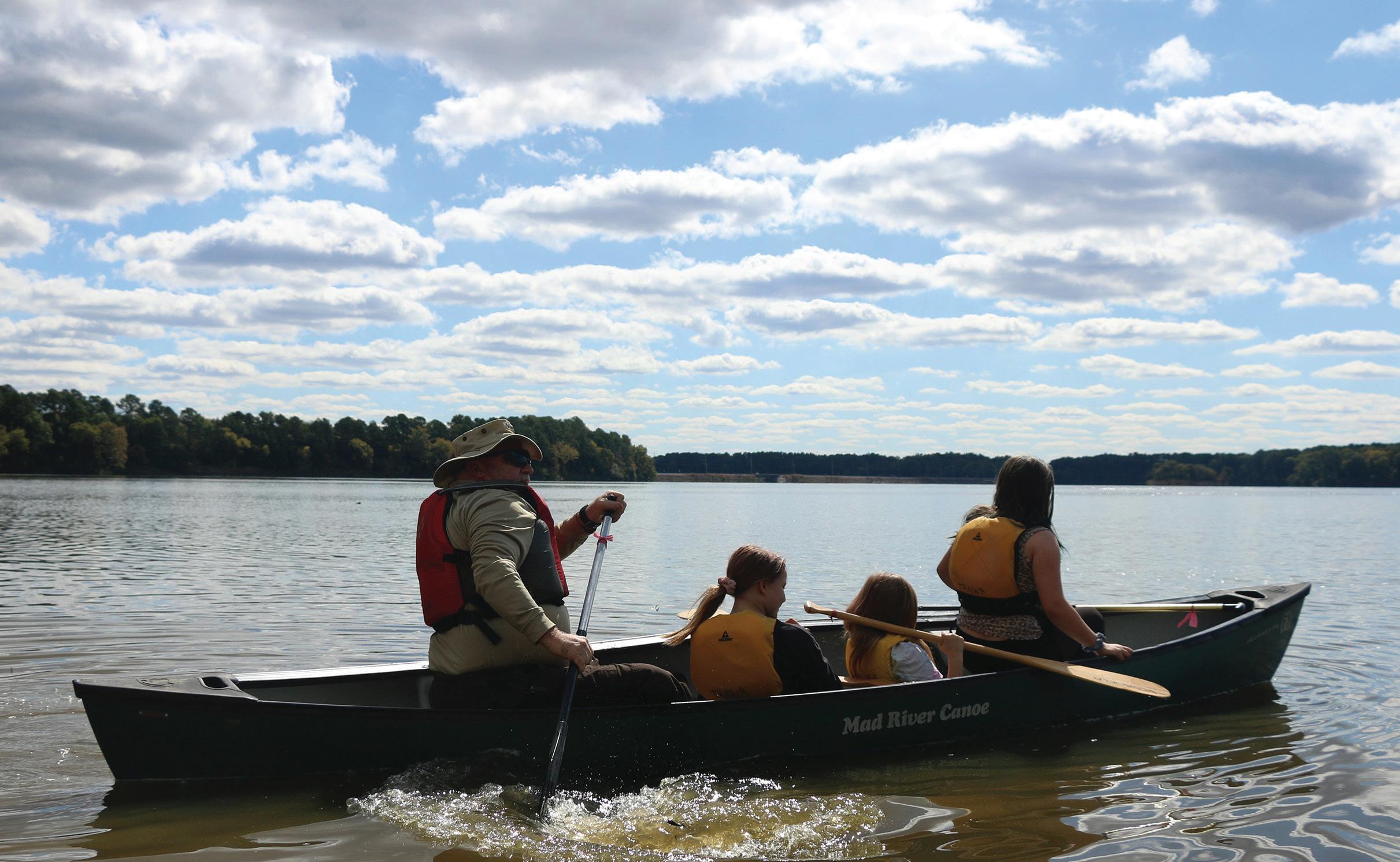 From left, Ranger Bob Dietrich takes passengers Rose Schultz, 9, Lorelai Schultz, 8, and Keneddy Watson, 10, on a short canoe trip on Crab Orchard Lake at the 75th anniversary celebration of Crab Orchard Oct. 8, 2022 at Crab Orchard National Wildlife Refuge in Marion, Ill. Naia McPherson | nmcpherson@dailyegyptian.com
