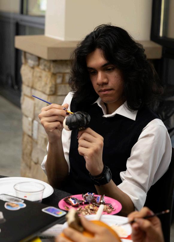 Benjamin Chavez paints a mini pumpkin half white and half black.