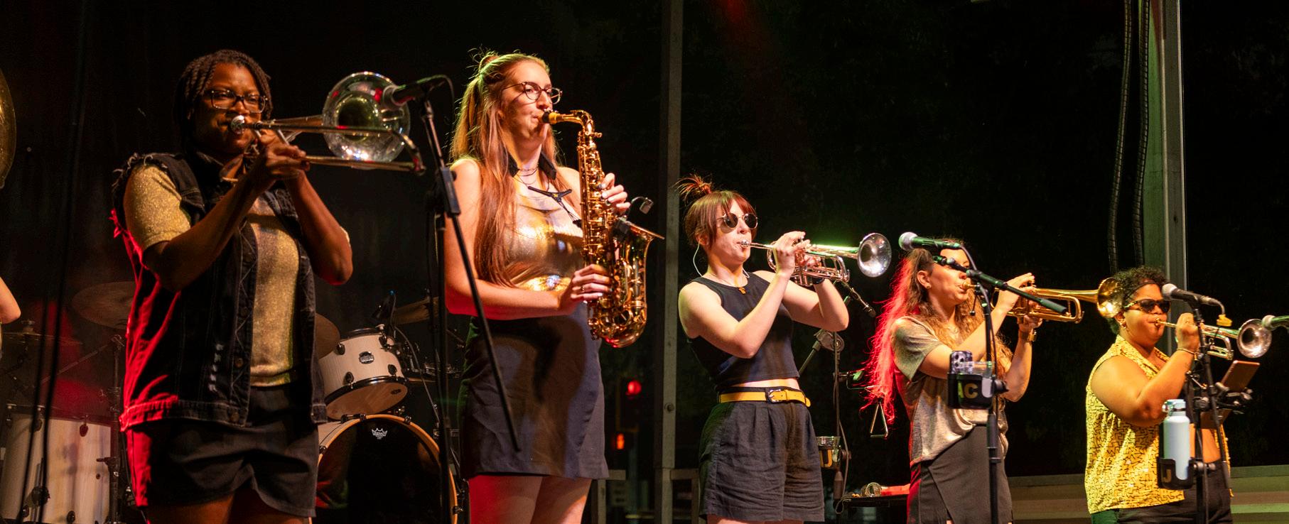 The all-female brass band Brass Queens brought high energy and genre-defying music to the Off the Rails concert series on Oct. 3, igniting the night with their New Orleans-inspired sound.