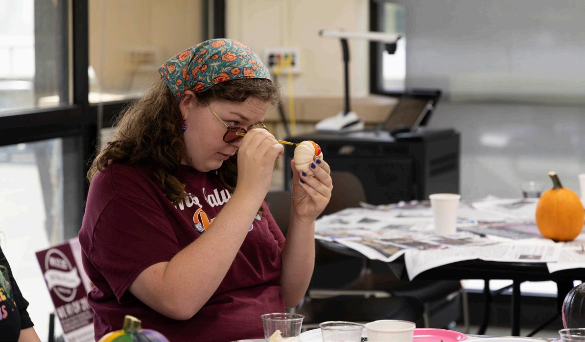 Juniper Oxford, coordinator of Paulette Curkin Pride Resource Center, paints a rainbow on a mini pumpkin Oct. 1, 2025 at Becker Pavilion in Carbondale, Illinois. Peyton Cook | @cookmesvisual