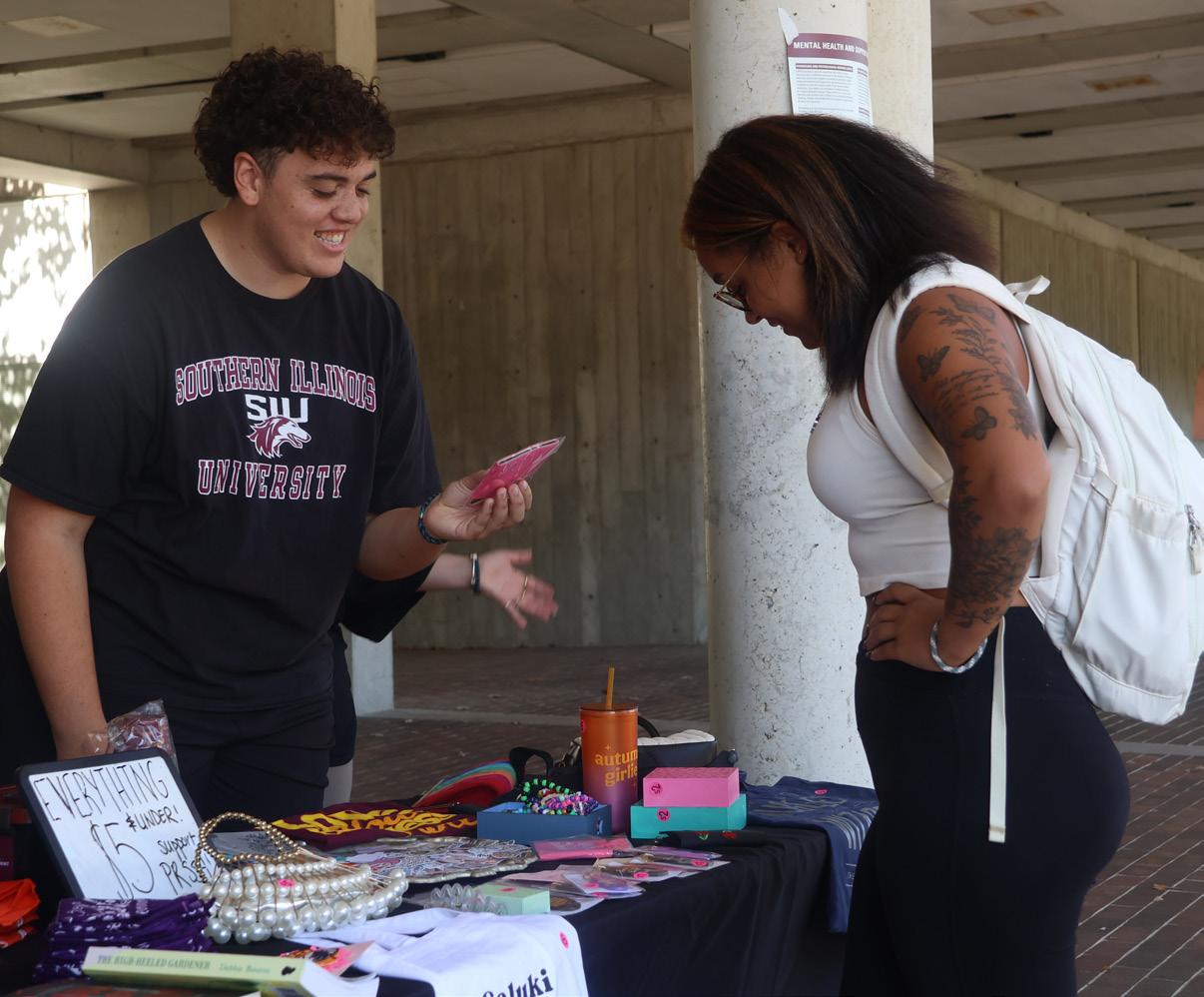 Isaiah Roth talks to a student about supporting PRSSA during a fundraising sale Oct. 3, 2025 at the Faner breezeway in Carbondale, Illinois. The organization sold snacks and other items for $5 or less. Amilia Estrada | aestrada@dailyegyptian.com