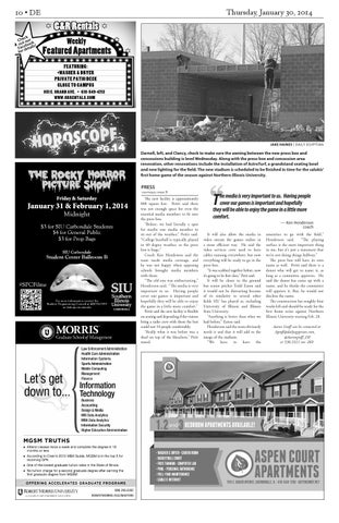 amenities to go with the field,” Henderson said. “The playing surface is the most important thing to me, but it’s just a statement that we’re not doing things halfway.” The press box will have its own name as well. Pettit said there is a donor who will get to name it, as long as a committee approves. He said the donor has come up with a name, and he thinks the committee will approve it. But, he would not disclose the name. The construction has roughly four weeks left and should be ready for the first home series against Northern Illinois University starting Feb. 28. Aaron Graff can be contacted at Agraff@dailyegyptian.com, @Aarongraff_DE or 536-3311 ext. 269