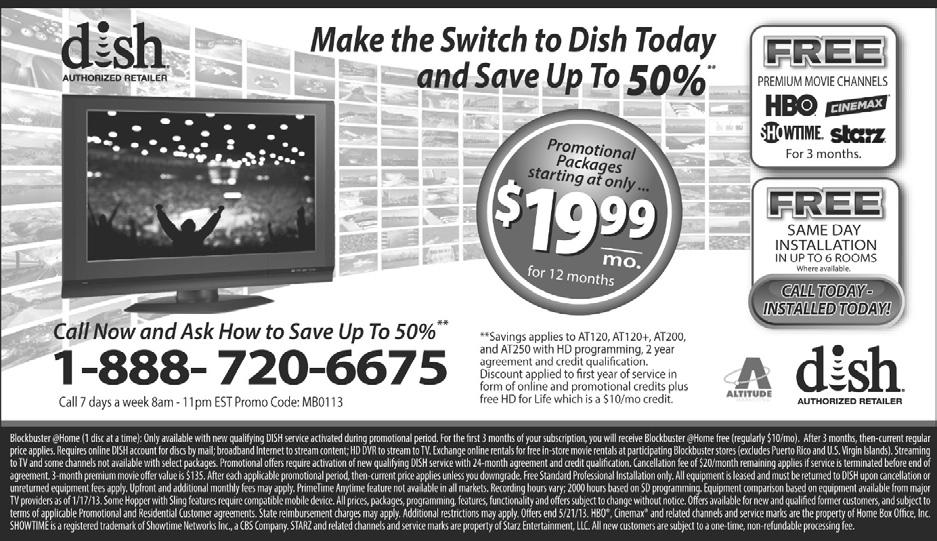 Section A • Valley Town Crier - February 27, 2013 www.yourvalleyvoice.com 4 Brownsville Bargain Book - South Edition - 3 x 5 Brownsville 101 E. Morrison Rd. In front of Target (956) 350-3391 Brownsville 2821 Boca Chica Blvd. In front of Wal-Mart (956) 542-5284 *Some restrictions may apply. See store for details. CASH STORE Boca Chica Blvd. Old Port Isabel Rd. WalMart CASH STORE Morrison Rd. Hwy. 77 Target All it takes is: Recent Pay Stub Driver’s License / State ID Checking Account Clear Title Driver’s License All it takes is: Title Loans up to $20,000 up to $2,000 Cash Advances You’re Cashworthy With Us! Fast, Friendly, Confidential service for over 10 years! 24 hour online applications for your convenience Get up to 20,000 Today! $ cashstore.com All it takes is: Recent Pay Stub Driver’s License / State ID Checking Account up to $2,000 Installment Loans 50% OFF! Restrictions apply, see store for details. 50% off the finance charges accrued as of first scheduled payment with a first time advance or loan. Must reference offer code 2070-7001at time of loan approval. Offer expires 3/31/2012 cashstore.com Call, Click, or Come in Today! Learn to Create Dutch Oven Breakfast