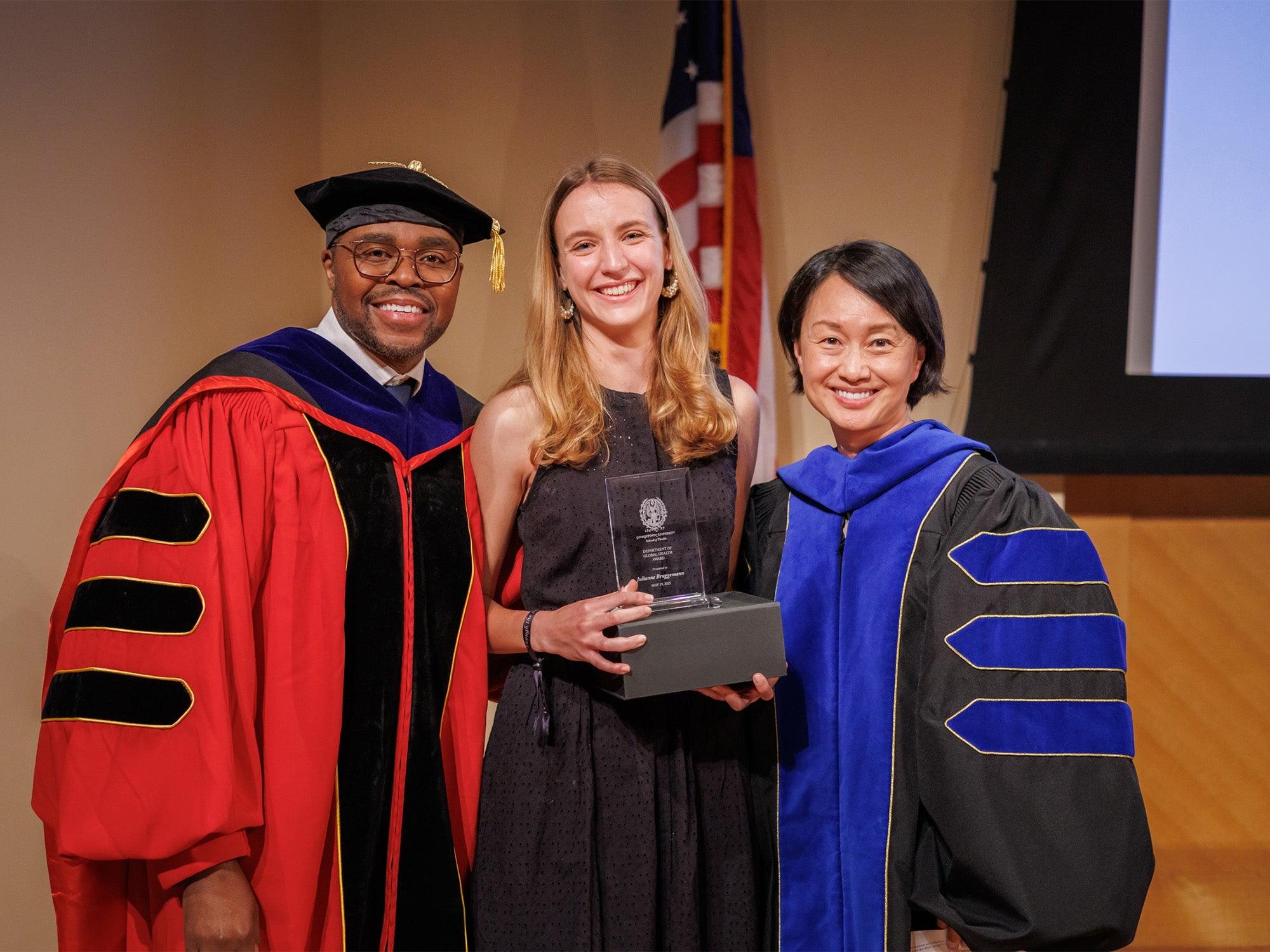 Dean King and Jennifer Bouey, chair of the Department of Global Health, presented Julianne Bruggemann (H’23) with the department’s Outstanding Student Award in Global Health.