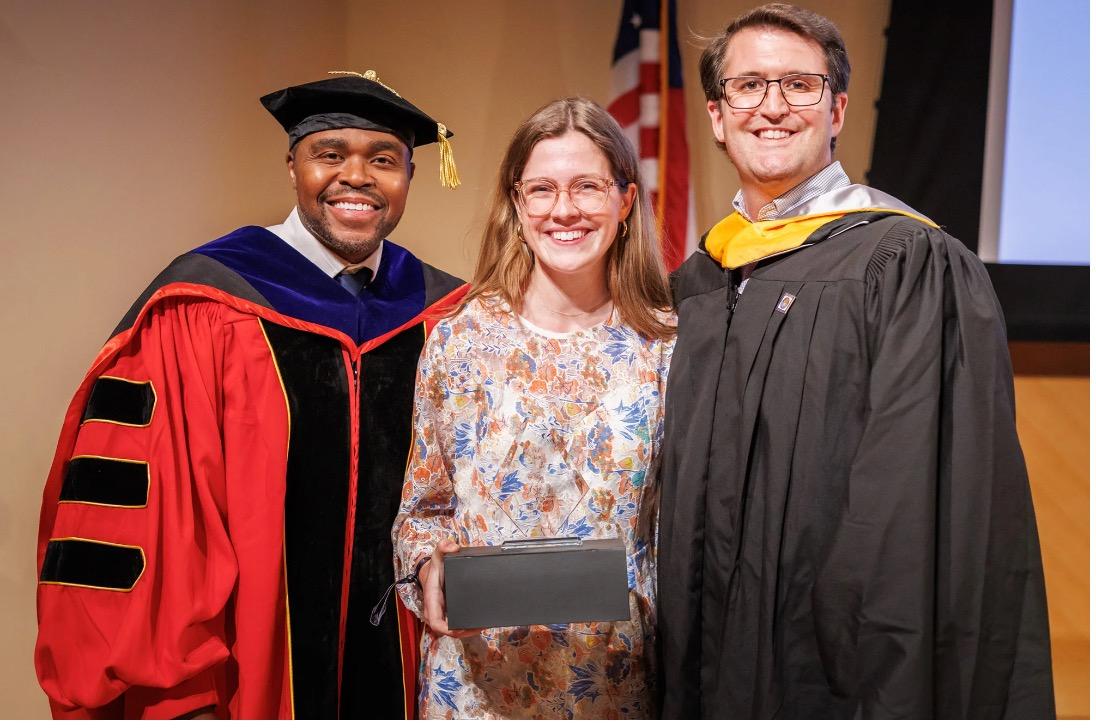 Abby Donnelly (H’23), received the Marianne Cardillo Lyons Commitment to Cura Personalis award in honor of former Associate Dean, Marianne Cardillo Lyons, She is congratulated here with School of Health Dean, Christopher King and Daniel Lyons (C’07, NHS’12), son of Marianne Cardillo Lyons.