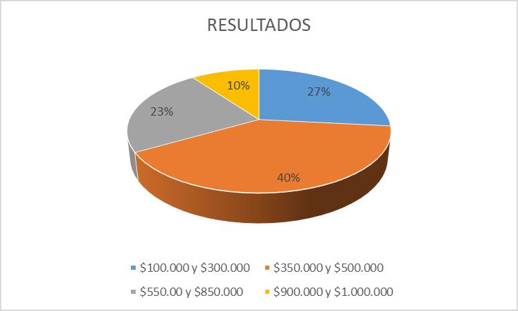 Análisis de la encuesta: Del total de las personas encuestadas el 27% estarían dispuesto a pagar a la hora de comprar implementos deportivos entre $100.000 y $300.000, el 40% estarían dispuesto a pagar a la hora de comprar implementos deportivos entre $350.000 y $500.000, el 23% estarían dispuesto a pagar a la hora de comprar muebles y enseres de oficina entre $550.000 y $850.000, mientras que el 10% estarían dispuesto a pagar a la hora de comprar muebles y enseres de oficina entre $900.000 y $1.000.000.