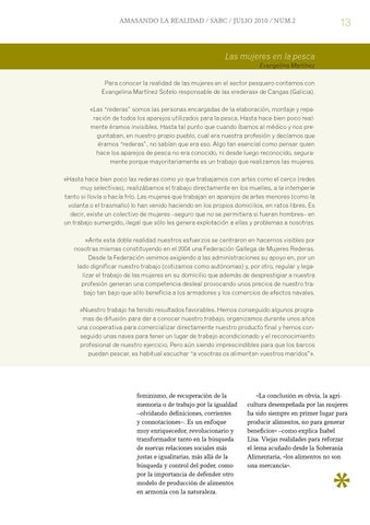 Las mujeres en la pesca Evangelina Martínez Para conocer la realidad de las mujeres en el sector pesquero contamos con Evangelina Martínez Sotelo responsable de las «rederas» de Cangas (Galicia). «Las “rederas” somos las personas encargadas de la elaboración, montaje y reparación de todos los aparejos utilizados para la pesca. Hasta hace bien poco realmente éramos invisibles. Hasta tal punto que cuando íbamos al médico y nos preguntaban, en nuestro propio pueblo, cual era nuestra profesión y decíamos que éramos “rederas”, no sabían que era eso. Algo tan esencial como pensar quien hace los aparejos de pesca no era conocido, ni desde luego reconocido, seguramente porque mayoritariamente es un trabajo que realizamos las mujeres. »Hasta hace bien poco las rederas como yo que trabajamos con artes como el cerco (redes muy selectivas), realizábamos el trabajo directamente en los muelles, a la intemperie tanto si llovía o hacía frío. Las mujeres que trabajan en aparejos de artes menores (como la volanta o el trasmallo) lo han venido haciendo en los propios domicilios, en ratos libres. Es decir, existe un colectivo de mujeres –seguro que no se permitiera si fueran hombres– en un trabajo sumergido, ilegal que sólo les genera explotación a ellas y problemas a nosotras. »Ante esta doble realidad nuestros esfuerzos se centraron en hacernos visibles por nosotras mismas constituyendo en el 2004 una Federación Gallega de Mujeres Rederas. Desde la Federación venimos exigiendo a las administraciones su apoyo en, por un lado dignificar nuestro trabajo (cotizamos como autónomas) y, por otro, regular y legalizar el trabajo de las mujeres en su domicilio que además de desprestigiar a nuestra profesión generan una competencia desleal provocando unos precios de nuestro trabajo tan bajo que sólo beneficia a los armadores y los comercios de efectos navales. »Nuestro trabajo ha tenido resultados favorables. Hemos conseguido algunos programas de difusión para dar a conocer nuestro trabajo, organizamos durante unos años una cooperativa para comercializar directamente nuestro producto final y hemos conseguido unas naves para tener un lugar de trabajo acondicionado y el reconocimiento profesional de nuestro ejercicio. Pero aún siendo imprescindibles para que los barcos puedan pescar, es habitual escuchar “a vosotras os alimentan vuestros maridos”».