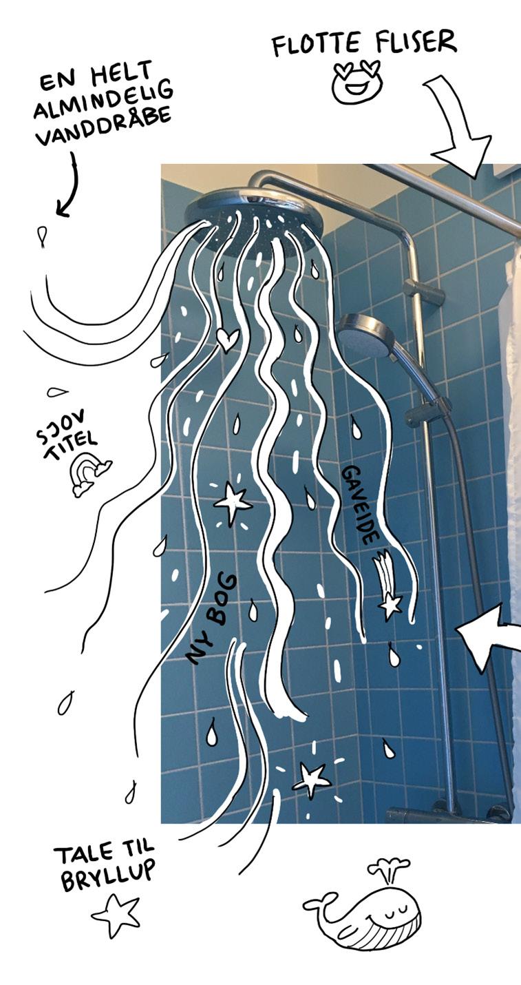 Det er ganske vist ikke ved skrivebordet, at jeg plejer at få mine idéer. I stedet har jeg sådan en smart installation i mit hus, hvor der kommer stråler af varmt vand ud, som på én eller anden måde forvandler sig til idéer, når de rammer mit hoved. Ikke nødvendigvis idéer til den historie, jeg sidder og arbejder på for tiden. Det kan lige så godt være idéer til fremtidige julekalendergaver, sjove titler på bøger, jeg aldrig har tænkt mig at skrive eller den præcise ordlyd til en tale i tilfælde af bryllup. Det er aldrig helt til at vide, hvad der kommer ud af idé-bruseren. Men det sker ikke desto mindre ret ofte, at der også dukker nogle idéer op til netop den historie, jeg sidder og skriver på. (Når jeg ellers sidder der).