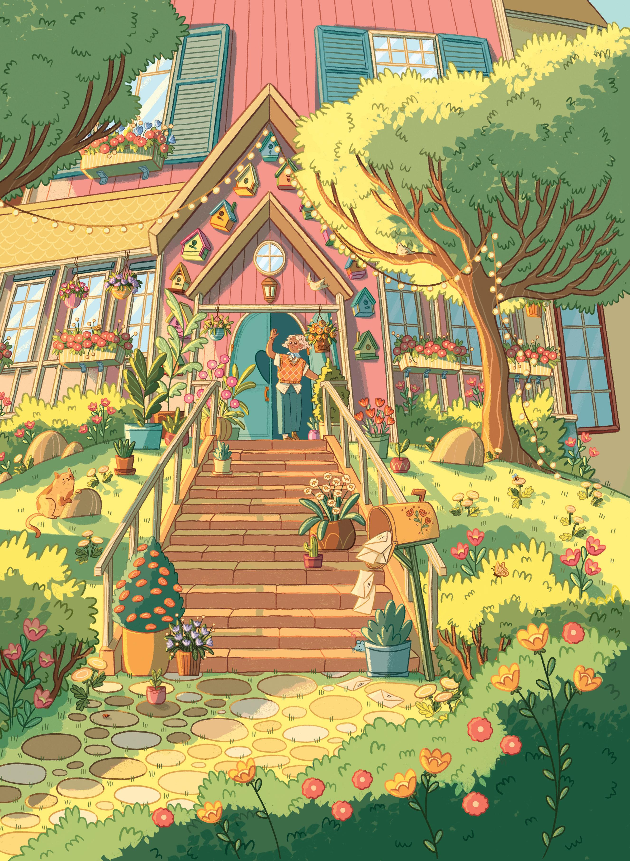 Her’ en sofa til seksten, en pejs og en kat, en jungle, en stor trampolin, et bibliotek og tre hem’lige rum, en hund og en plettet kanin.