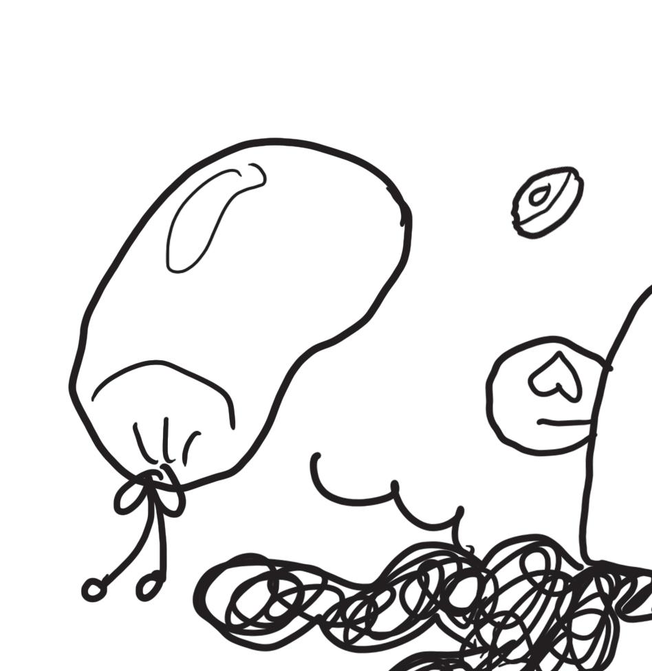 Hun roder i sin turtaske og hiver en papirspose frem.