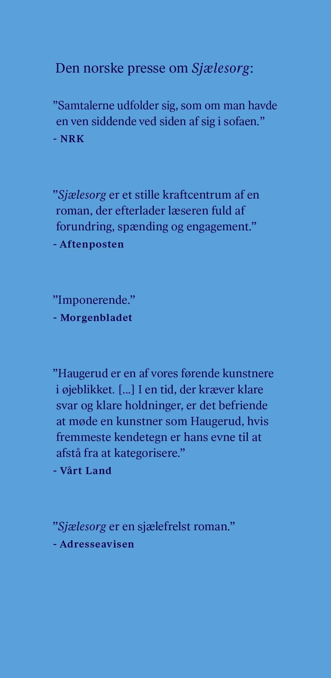 er oversat fra norsk af Martin Bastkjær efter Sjelesorg © Dag Johan Haugerud