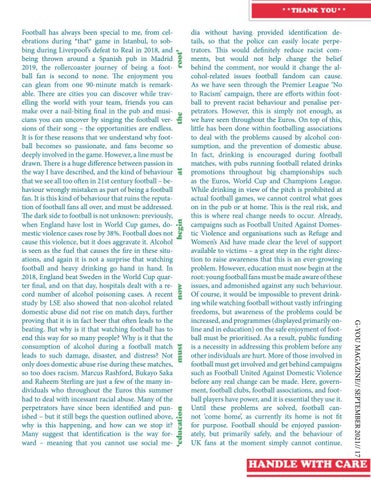 dia without having provided identification details, so that the police can easily locate perpetrators. This would definitely reduce racist comments, but would not help change the belief behind the comment, nor would it change the alcohol-related issues football fandom can cause. As we have seen through the Premier League ‘No to Racism’ campaign, there are efforts within football to prevent racist behaviour and penalise perpetrators. However, this is simply not enough, as we have seen throughout the Euros. On top of this, little has been done within footballing associations to deal with the problems caused by alcohol consumption, and the prevention of domestic abuse. In fact, drinking is encouraged during football matches, with pubs running football related drinks promotions throughout big championships such as the Euros, World Cup and Champions League. While drinking in view of the pitch is prohibited at actual football games, we cannot control what goes on in the pub or at home. This is the real risk, and this is where real change needs to occur. Already, campaigns such as Football United Against Domestic Violence and organisations such as Refuge and Women’s Aid have made clear the level of support available to victims – a great step in the right direction to raise awareness that this is an ever-growing problem. However, education must now begin at the root: young football fans must be made aware of these issues, and admonished against any such behaviour. Of course, it would be impossible to prevent drinking while watching football without vastly infringing freedoms, but awareness of the problems could be increased, and programmes (displayed primarily online and in education) on the safe enjoyment of football must be prioritised. As a result, public funding is a necessity in addressing this problem before any other individuals are hurt. More of those involved in football must get involved and get behind campaigns such as Football United Against Domestic Violence before any real change can be made. Here, government, football clubs, football associations, and football players have power, and it is essential they use it. Until these problems are solved, football cannot ‘come home’, as currently its home is not fit for purpose. Football should be enjoyed passionately, but primarily safely, and the behaviour of UK fans at the moment simply cannot continue.