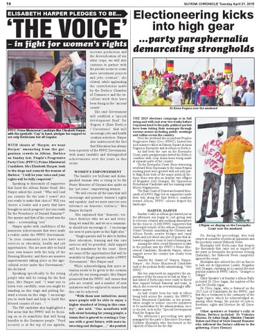 …party paraphernalia – in fight for women’s rights demarcating strongholds increase production and the diversification of our other crops, we will also continue to partner with the private sector to create more investment projects and jobs creation”, she related, while applauding the contributions made by the Berbice Chamber of Commerce and the excellent work they have been doing in the ‘ancient county’. She said Government will establish a ‘special development fund’ for Region 6 (East Berbice / Corentyne) that will PPP/C Prime Ministerial Candidate Mrs Elisabeth Harper, with the symbolic ‘Cup’ in hand, pledges her support to encourage jobs and health not only Berbicians but all Guyana creation activities. Harper also underscored the fact WITH chants of ‘Harper, we want that Education has always Harper ’ emanating from the gar- been a priority of the PPP/C Government, gantuan crowds in Albion, Berbice with many laudable and distinguished on Sunday last, People’s Progressive achievements over the years in this Party/Civic (PPP/C) Prime Ministerial sector. Candidate, Mrs Elisabeth Harper, took to the stage and assured the women of WOMEN’S EMPOWERMENT Berbice: “I will be your voice and your The humble yet brilliant and distinrights will be fully respected.” guished woman who is vying to be the Speaking to thousands of supporters Prime Minister of Guyana also spoke on that lined the Albion Estate Road, Mrs her ‘pet issue’, empowering women. Harper asked the crowd: “Who will lead “We will review all the laws that will our country for the next 5 years? Are encourage and promote women’s rights you ready to make that choice? Will you and equality. And we must exercise zero choose a leader and a party that have tolerance on domestic violence,” Mrs brought so much progress? Are you ready Harper declared. for the Presidency of Donald Ramotar?” She explained that “domestic vioHer answer and that of the crowd was the lence destroys who we are and everysame - a resounding ‘yes!’ thing we stand for, and we as a communiHarper spoke with confidence of the ty should not encourage it…I encourage numerous achievements that were made our men to participate in this fight also.” a reality under the PPP/C Government. “Single parents will be able to further “In your community you have more their education; training and day care services in education, health and job services will be provided, child support opportunities. You are now able to build will be mandatory by the court…these your own homes with the help of the are some of the opportunities that will be Housing Ministry; and there are massive available to Single parents under a PPP/C improvements taking place in the agri- Government,” Mrs Harper said. cultural sector under this Government,” While acknowledging that more atshe declared. tention needs to be given to the creation Speaking specifically to the young of jobs for our young people, Mrs Harper people who will be voting for the first promised that the PPP/C will ensure that time, Mrs Harper said: “I want you to jobs are created, and a number of new listen very carefully; soon you might be initiatives will be explored to ensure that standing on this stage and putting for- this can be achieved. ward a vision on this stage. I encourage “With these new initiatives, many you to work hard and help to build this more people will be able to enjoy a blessed country of ours…” higher standard of living in this counThe PM candidate also highlighted a try”, she said. “Our manifesto will few areas that the PPP/C will be focus- talk about housing for young people, a ing on in its manifesto that will bring vision that is geared to creating a Guybenefits to the Guyanese people. “Food ana with a great future, with more insecurity is at the top of our agenda, teracting and dialogue…,” she posited.