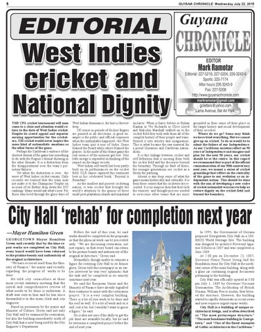grounded in their sense of their place in the larger history and social development of their societies. Where do we go? Some may think we have tried everything. But we cannot give up on cricket. To do so would be to admit the failure of our Independence. As our Caribbean societies reflect on 50 years of Independence and imagine and plan for the next 50 years, our cricket should be at the centre. In this regard we recommend that as part of the official commemoration of our 50th anniversary next year, we mount a series of cricket groundings that reflect on the centrality of the game to our evolution as an independent nation. This should be done with the aim of developing a new cadre of cricket nationalist-warriors to help us restore dignity on the cricket field and beyond the boundary.
